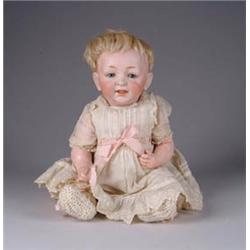 13” J.D.K. 211 BABY. A nice example of a popular JDK baby. This little fellow is all original and on a composition baby body. Baby has blue glass sleep eyes, open/close mouth, blonde mohair wig and white cotton dress. He is ready to set on your shelf. CONDITION: Wig has not been fully removed from head but examination reveals no damage to bisque. Composition body appears to be in very fine condition with slight paint touch up to baby’s knees. JL 1-3127