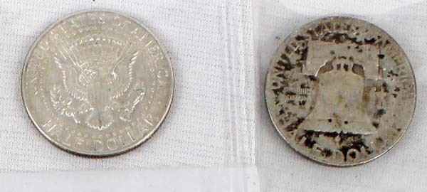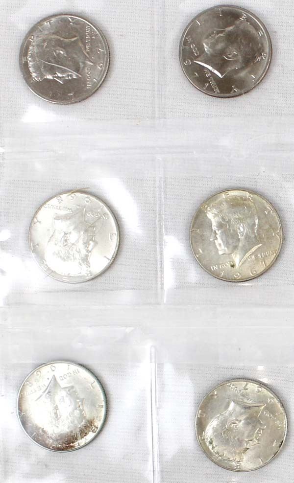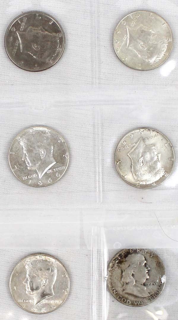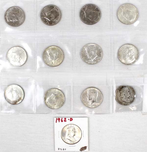 13 Kennedy and Franklin Half Dollars, includes 1951 Franklin, 1962D Franklin, Two-1965 Kennedy, 1966 Kennedy, Two-1967 Kennedy, Two-1968 Kennedy, 1969 Kennedy, Three-1971 Kennedy,