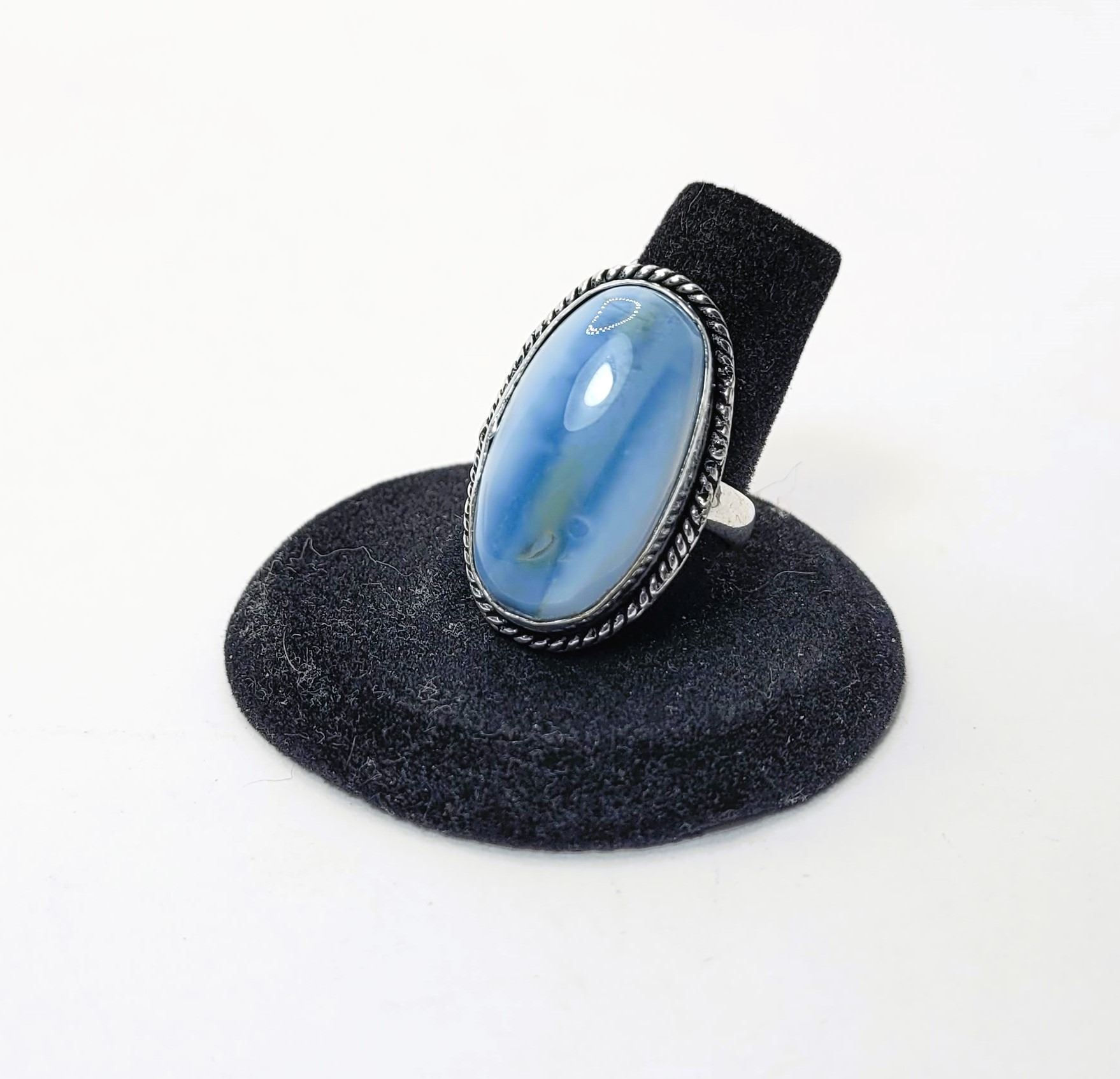 13) NATURAL OVAL BLUE OWYHEE OPAL RING, SIZE