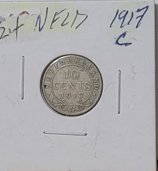 13) NEWFOUNDLAND 1917 DIME, 92.5% SILVER.