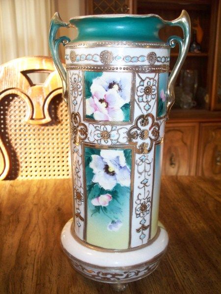 13" NIPPPON VASE, PASTEL GREEN AND YELLOW, DBL HANDLE