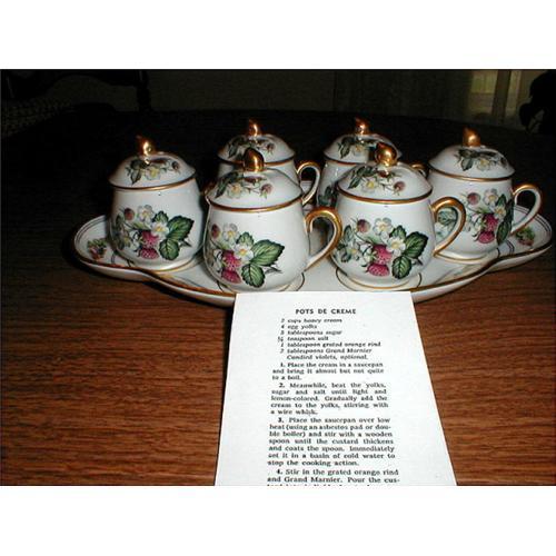 UP FOR SALE IS A BEAUTIFUL 13 PIECE LIMOGES POTS DE CREME SET THAT IS IN VERY GOOD CONDITION WITH NO CHIPS, CRACKS, HAIRLINES, OR REPAIRS AND ALSO HAS THE RECIPE TO GO ALONG WITH IT. EACH COVERED POT MEASURES 3 1/2 IN. TALL WITH THE COVER ON AND 3 1/2 IN. IN DIAMETER AND ARE SIGNED, LIMOGES FRANCE. THE TRAY MEASURES 12 1/4 IN. IN LENGTH AND 7 1/2 IN. IN WIDTH AND IS NOT SIGNED. THE COVERED POTS HAVE A STRAWBERRY DESIGN WHILE THE TRAY HAS FLOWERS.