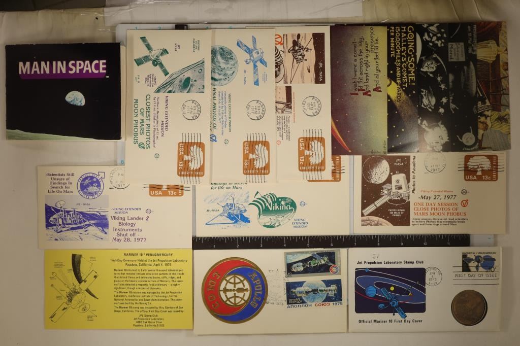 WITH METAL TOKEN (JET PROPULSION LABRATORY STAMP CLUB), 5-1984 HALLEY'S COMET POSTCARDS AND MAN IN SPACE BOOKLET FEATURING PROJECT MERCURY, PROJECT GEMINI, PROJECT APOLLO AND LISTS THE FLIGHTS AND ASTRONAUTS FROM