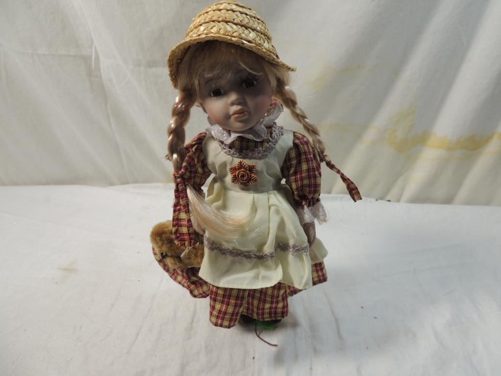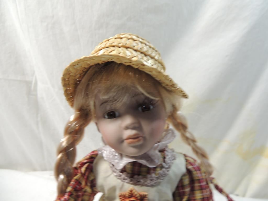 PARIRE FARM GIRL BLONDE HAIR IN BRAIDS BROWN EYES PLAID DRESS WITH APRON, STUFFED TEDDY BEAR, ON STAND UNMARKED DOLL. AS SHOWN SEE PHOTO FOR MORE DETAILS