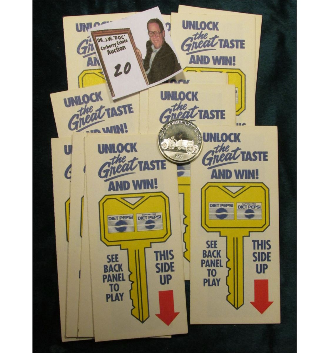 (13) Peel Here Advertising Cards "Unlock the Great Taste and Win Diet Pepsi" depicting automobile key; & Sterling Silver Medal "1907 Locomobile Cup Racer", Proof, 26mm