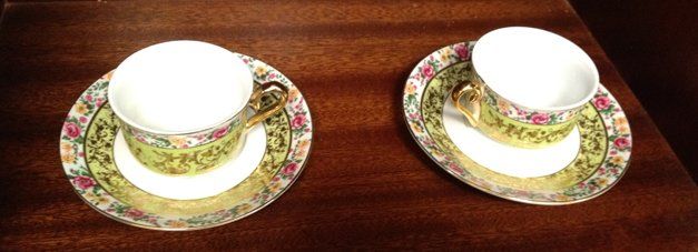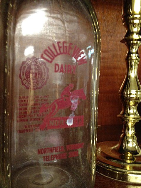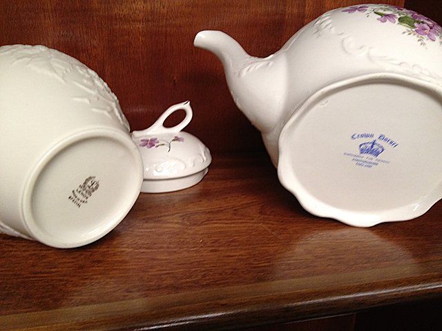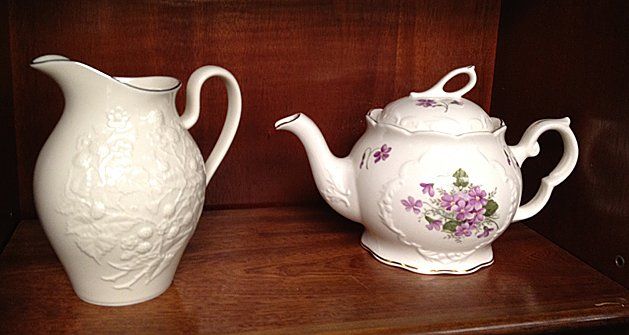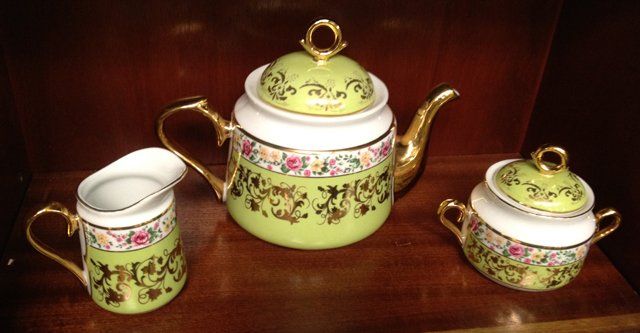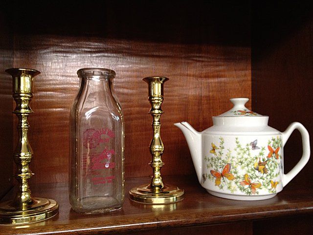 13 piece estate lot including College View Dairy, Norwich Milk Bottle, Crown Dorset, Staffordshire, England Teapot with purple flowers, Tea Set (tea pot, creamer, sugar and 2 tea cups) ornate with flowers, green and gold trim and handles, brass candle sticks, tea pot with butterflies.