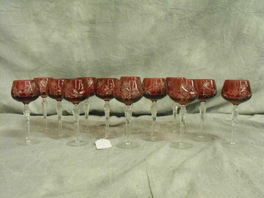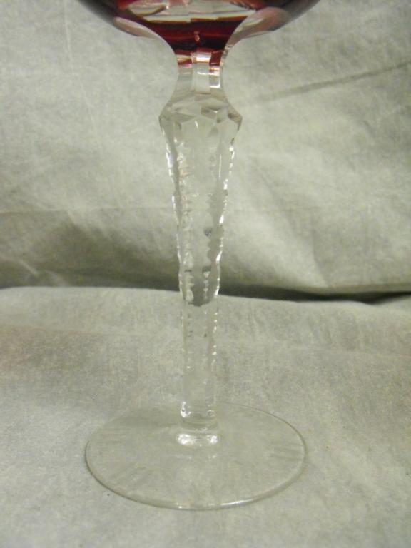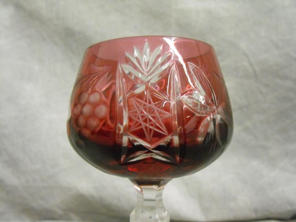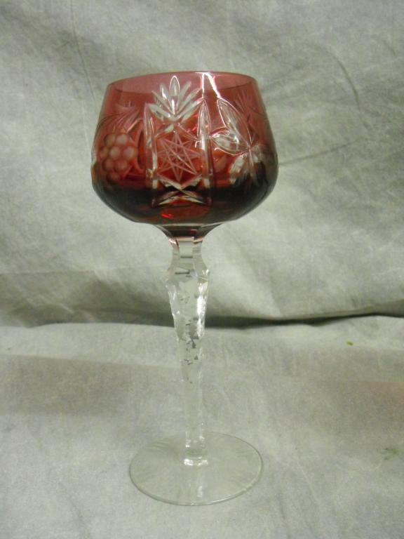 Set of beautiful cranberry crystal wine glasses with grape flower and star pattern etching, in near new condition 8" tall