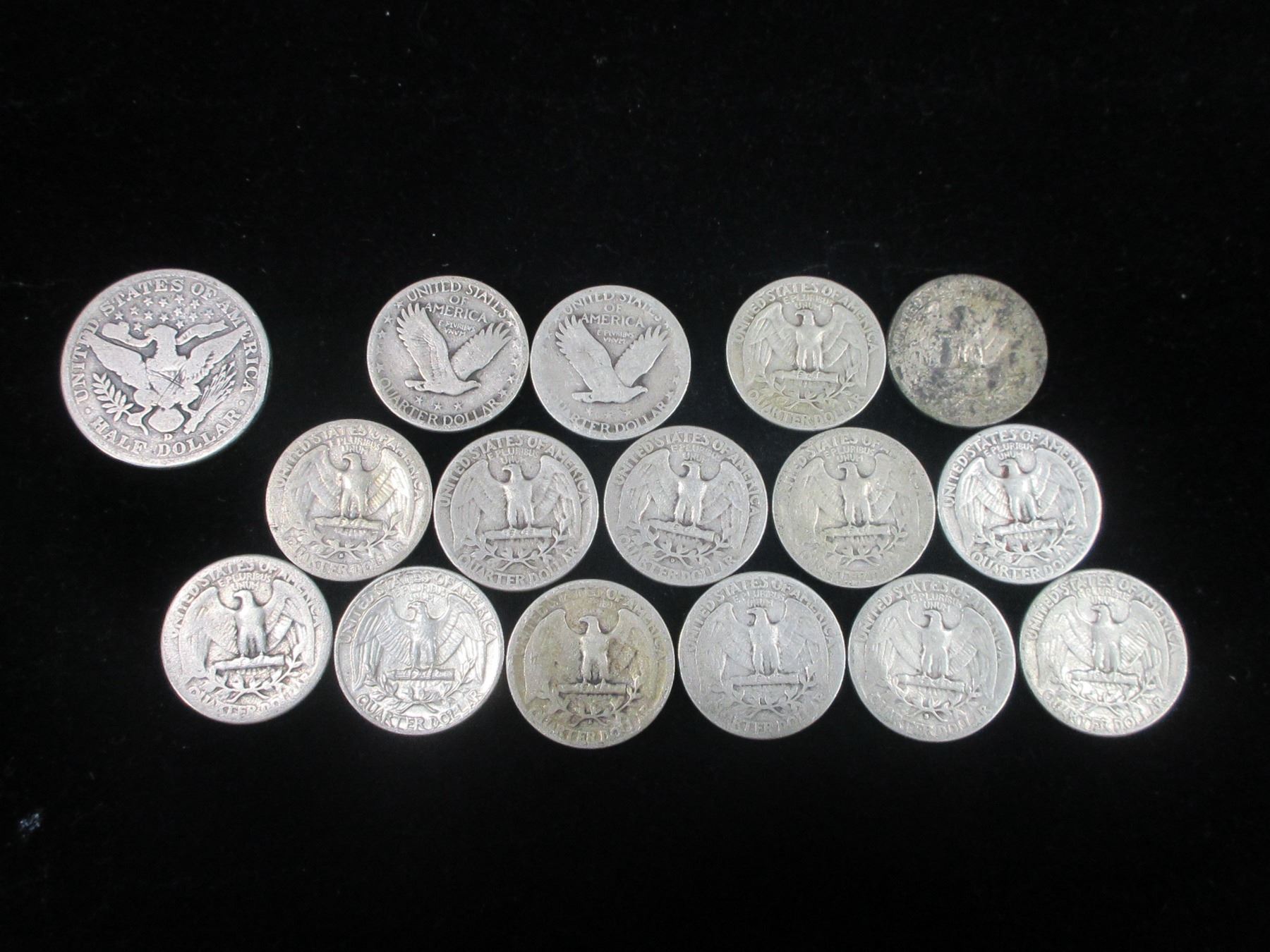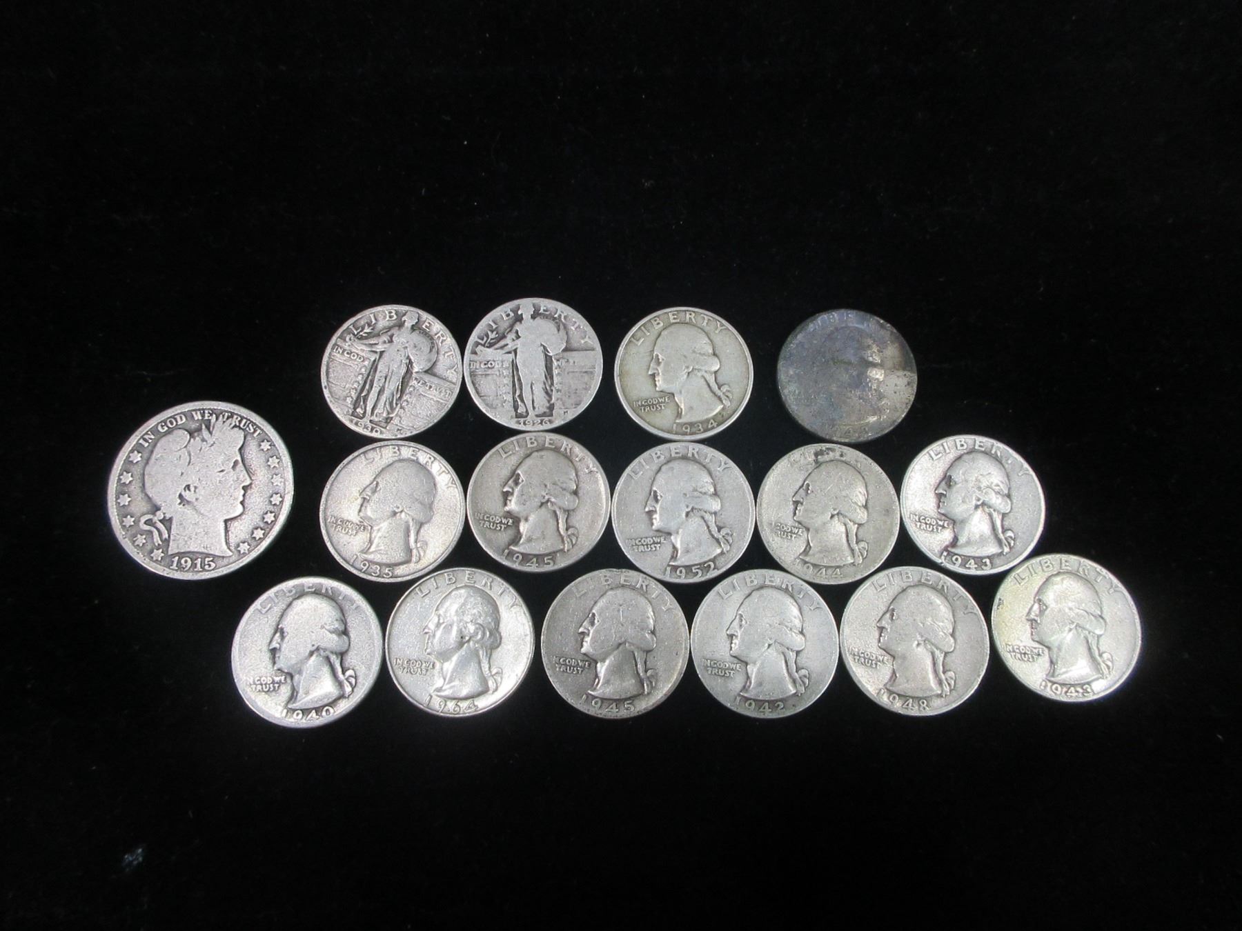 13 Pre '65 Washington Quarters- 2 Standing Liberty Quarters- 1915 Barber Half Dollar