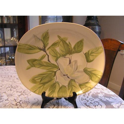 The magnolia is a very popular flower used in decoration now. Being from Mississippi, which is the magnolia state, I am partial to these beautiful, fragrant flowers. This Redwing platter is lovely. The green is called chartreuse, but also has other greens in it. In good condition with no chips or breaks.
