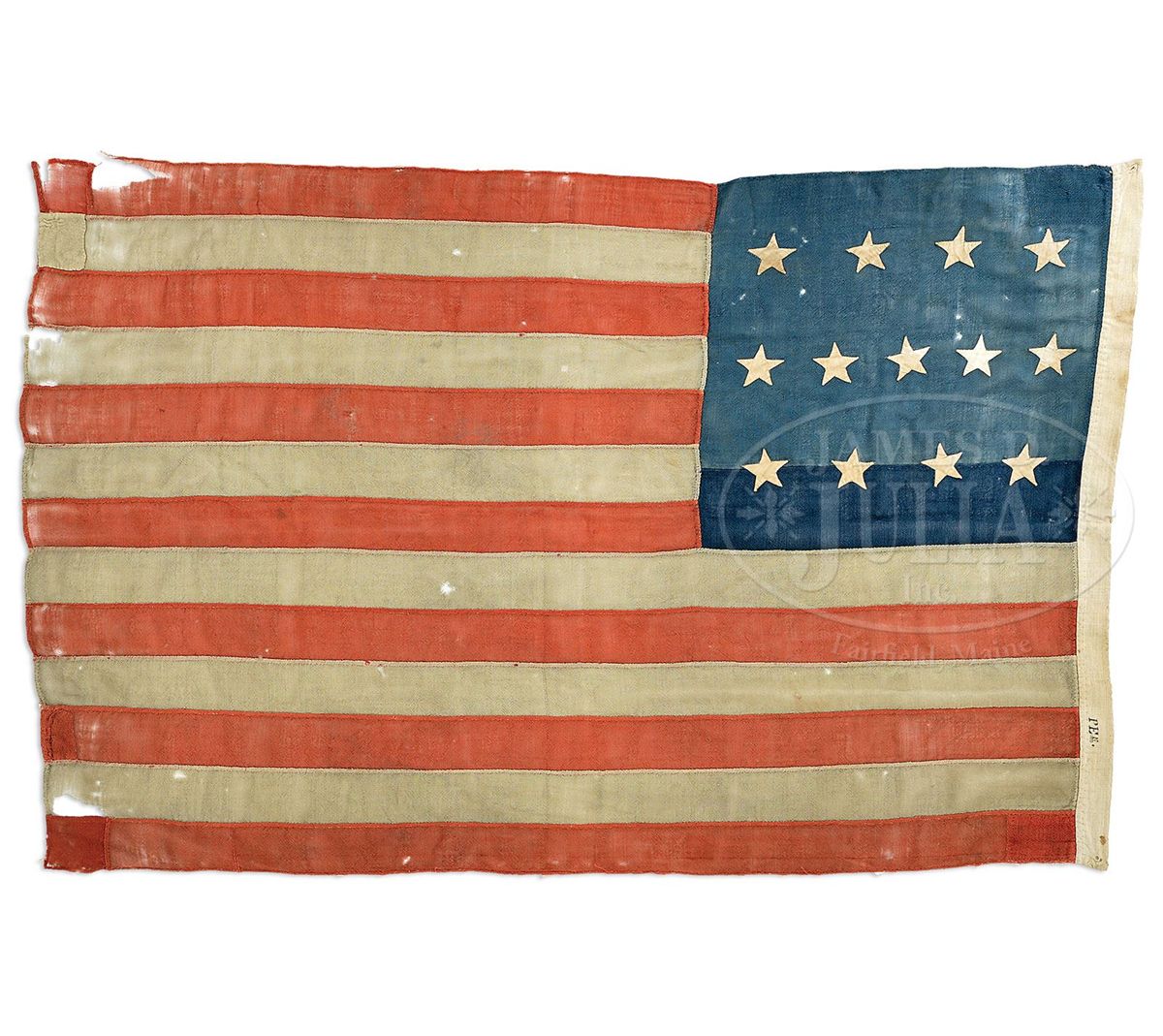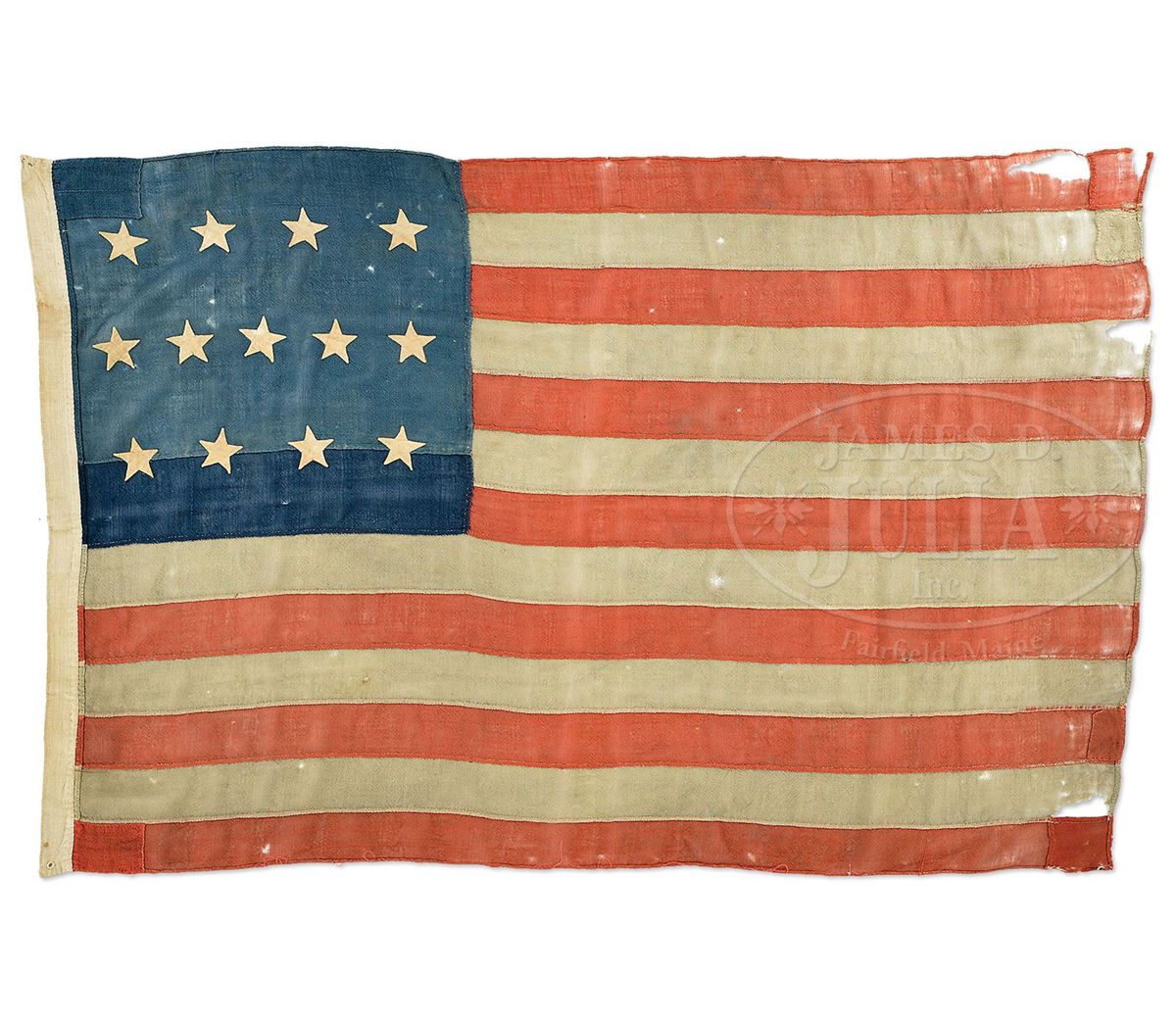 58" x 37" all hand-sewn, wool bunting with double applique and 2-1/2" cotton stars. This is a fine all hand-sewn 4,5,4 configured American 13 star flag, possibly for a boat ensign, made of typical early-mid-19th century materials and sewing techniques. The 1-3/4" linen hoist has 2 hand-whipped eyelets and an added small brass ring sewn at center point of hoist. Bunting is a very loose, light weight and single ply. There is a small cord sewn the entire length on top and bottom of flag. Corners of flag at hoist are reinforced with about a 3" x 4" pieces of same colored bunting. Cotton stars have folded-under edges and double applique. Canton is made uniquely from 2 pieces of bunting with different colors of blue, as can be seen in photos. There is an ink inscription on hoist "PEn." of unknown meaning. This is a beautiful small size pre-Civil War 13 star flag rarely found in such fine condition. CONDITION: Flag is very good overall with good color, as can be seen in photos. There are scattered small holes and areas of soiling. There are tears and several contemporary repairs on fly edge, as can be seen in photos, that do not affect esthetics. 4-48828 JS50
