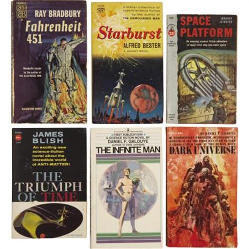 <B>Thirteen Science-Fiction and Exploitation Paperbacks, Three Signed</B></I>, including: <B>L.</B></I> <B>Sprague de Camp. </B></I><B><I>Rogue Queen</B></I></B></I>. New York: Dell, [1951]. Twelvemo. 192 pages. Overall near fine with minor wear and toning. [and:] <B>Claire Morgan. </B></I><B><I>The Price of Salt</B></I></B></I>. New York: Bantam Books [1952]. Twelvemo. 249 pages. Overall near fine with minor wear. Claire Morgan was a pseudonym used by novelist Patricia Highsmith (1921-1995). [and:] <B>Ray Bradbury.</B></I> <B><I>Fahrenheit 451</B></I></B></I>. New York: Ballantine Books [1953]. Inscribed and signed inside the front cover by the author. Twelvemo. 199 pages. Overall very good with wear and cracking along the spine. Stored in red cloth slipcase in fine condition. [and:] <B>Murray Leinster. </B></I><B><I>Space Platform</B></I></B></I>. New York: Pocket Books, Inc. [1953]. Twelvemo. 167 pages. Overall very good with some toning and wear. [and:] <B>Richard Matheson</B></I><B><I>. Third from the Sun</B></I></B></I>. New York: Bantam Books [1954]. Twelvemo. 180 pages. Overall near fine with minor wear. [and:] <B>Robert Crane. </B></I><B><I>Hero's Walk</B></I></B></I>. New York: Ballantine Books [1954]. Twelvemo. 196 pages. Overall near fine with minor wear and toning. [and:] <B>Frank Herbert. </B></I><B><I>21st Century Sub</B></I></B></I>. New York: Avon Books [1956]. Twelvemo. 190 pages. Overall near fine with minor wear. [and:] <B>Alfred Bester. </B></I><B><I>Starburst</B></I></B></I>. New York: Signet Books [1958]. Twelvemo. 160 pages. Overall near fine with minor wear and some marks along bottom edges of paper. [and:] <B>James Blish. </B></I><B><I>The Triumph of Time</B></I></B></I>. New York: Avon Publications, Inc. [1958]. Twelvemo. 158 pages. Overall near fine with minor wear. [and:] <B>Daniel F. Galouye. </B></I><B><I>Dark Universe</B></I></B></I>. New York: Bantam Books [1961]. Twelvemo. 154 pages. Overall very good with some wear and staining. [and:] <B>Harlan Ellison. </B></I><B><I>Rockabilly</B></I></B></I>. London: Frederick Muller [1961]. Signed by the author on the title page. Twelvemo. 176 pages. Near fine with minor wear. [and:] <B>Edmond Hamilton. </B></I><B><I>Outside the Universe</B></I></B></I>. New York: Ace Books [1964]. Inscribed and signed by the author inside the front cover. Twelvemo. 173 pages. Overall very very good with moderate wear. [and:] <B>Daniel F. Galouye. </B></I><B><I>The Infinite Man</B></I></B></I>. New York: Bantam Books [1973]. Twelvemo. 202 pages. Overall fine with minor wear. <I>From the Robert and Diane Yaspan Collection.</B></I><BR><BR><b>Shipping:</b> Books & Catalogs (<a target="_blank" href="http://www.heritageauctions.com/common/shipping.php">view shipping information</a>)