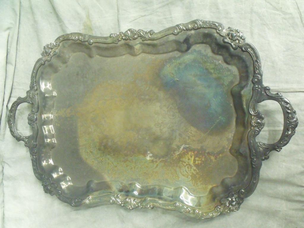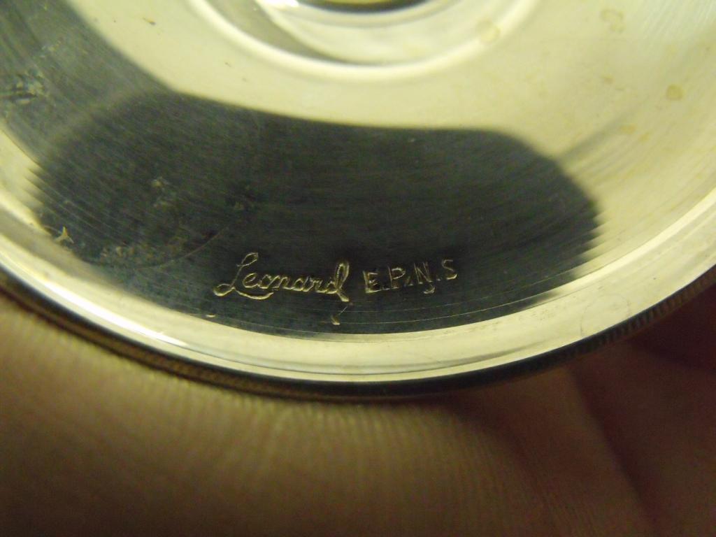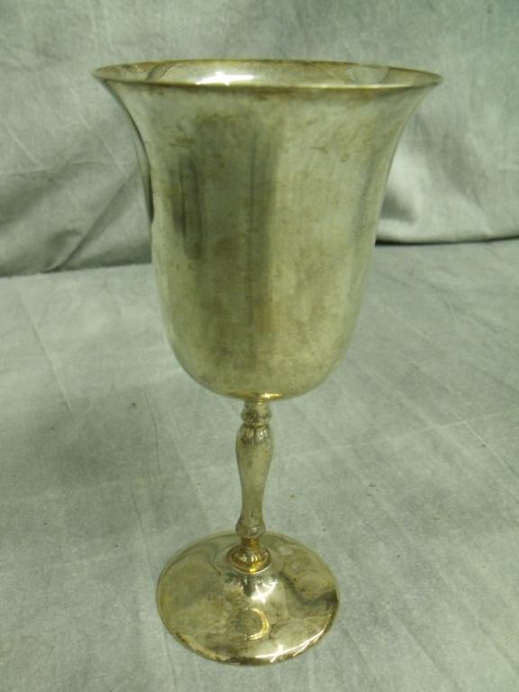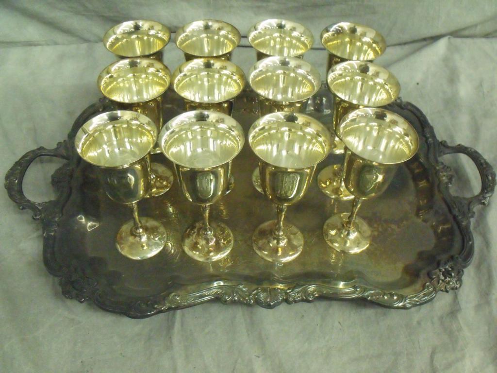 12 vintage Leonard electroplated nickle silver wine goblets7.5" tall. With large ornately boardered handeled serving tray with scroll feet 30"x17" has some tarnishing.