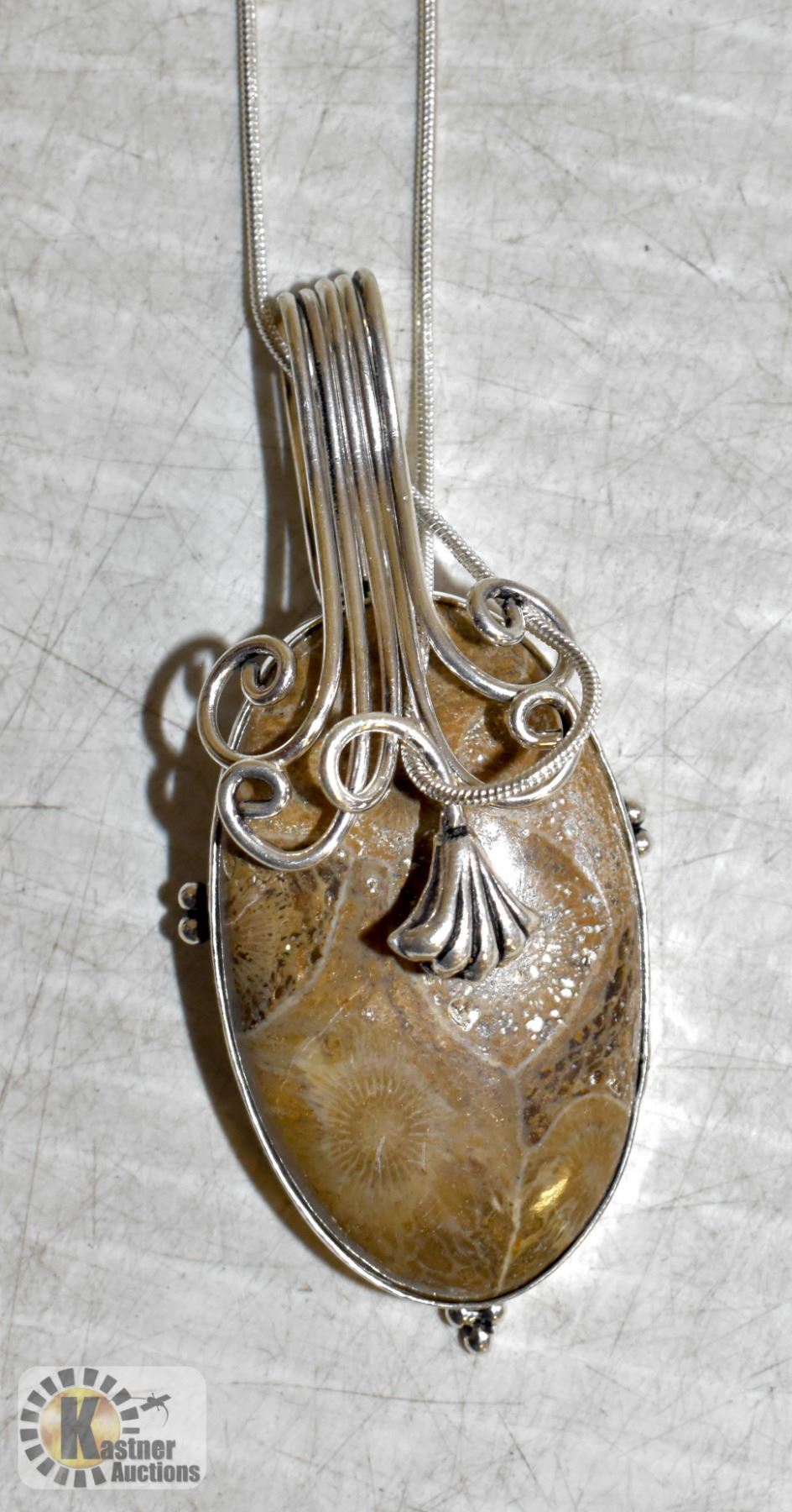 SILVER PLATED, OVAL IN SHAPE WITH AN 18" SNAKE CHAIN. JEWELLERY