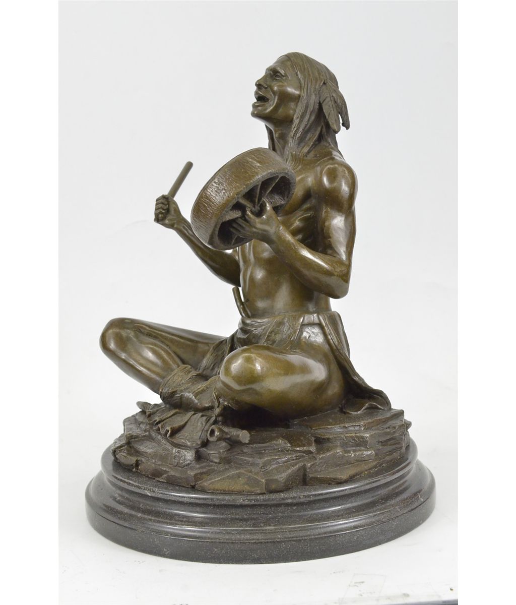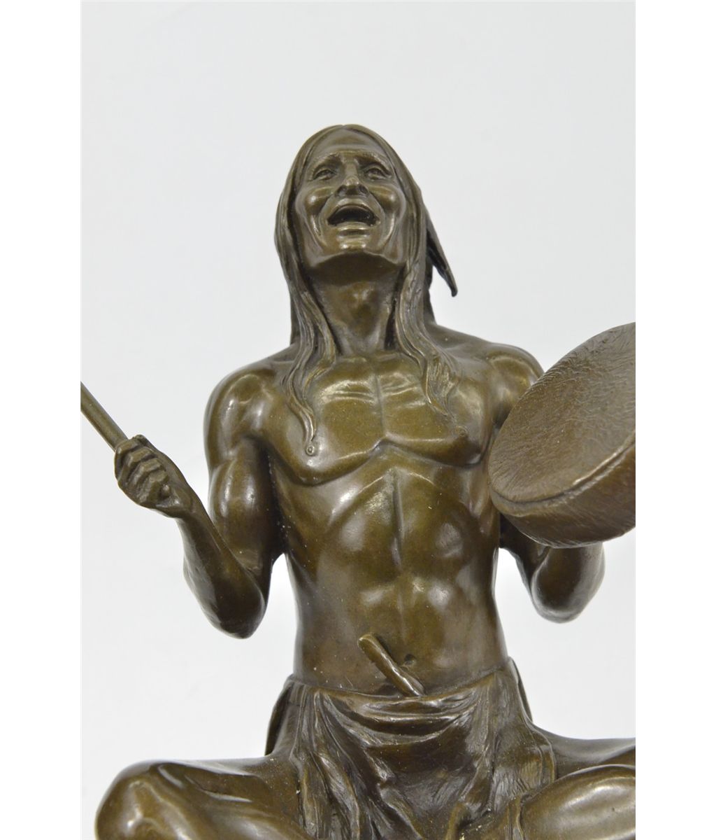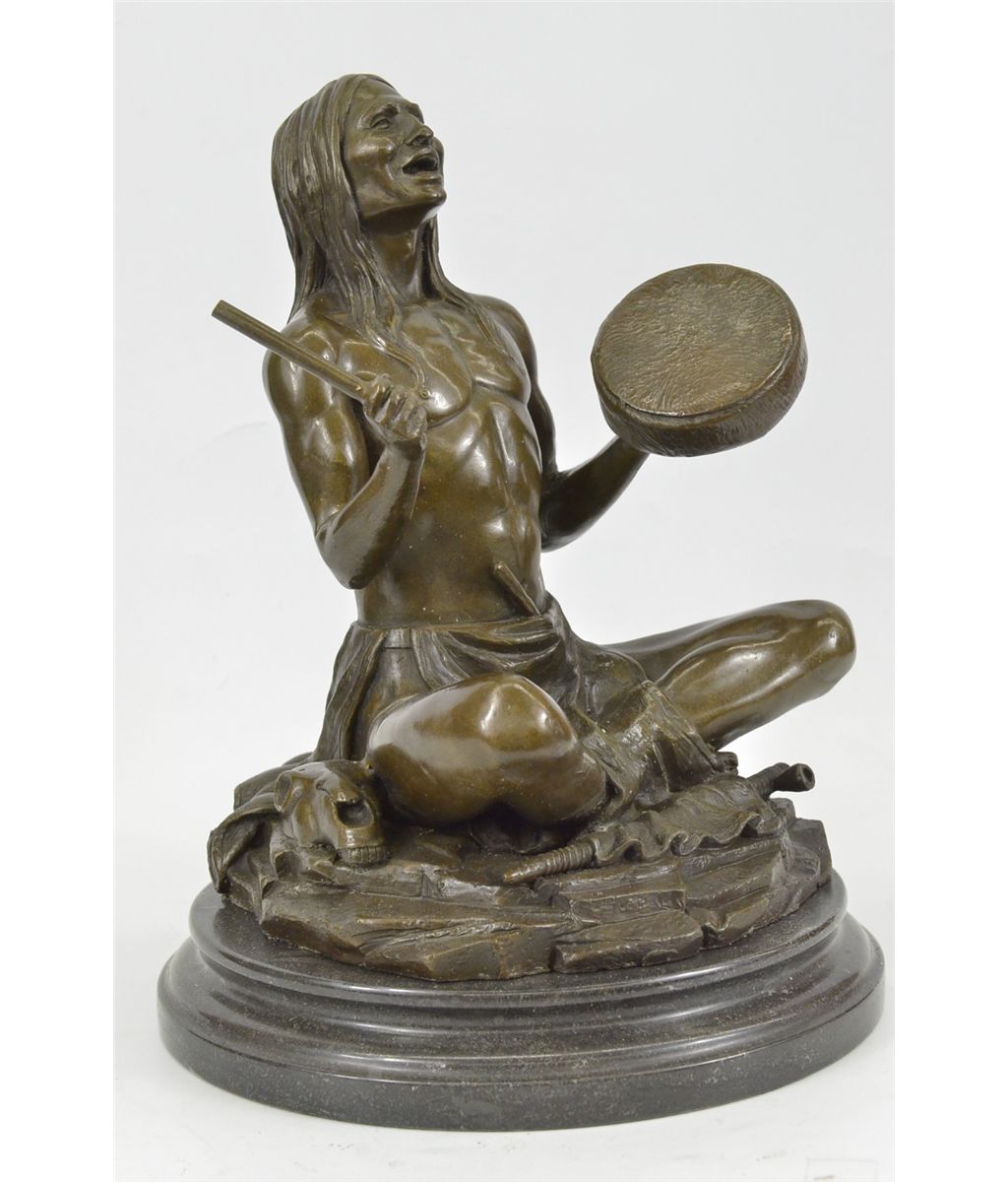 11XN080080 The Shaman Native American Indian Sits Indian-Style, Chanting Prayers, Banging On A Small Hand Drum, In Hopes Of Communicating With The Spirit World. Shamanism Encompasses The Belief That Shamans Are Intermediaries Or Messengers Between The Human World And The Spirit Worlds. Shamans Are Said To Treat Ailments And Illness By Mending The Soul. Alleviating Traumas Affecting The Spirit Restores The Physical Body Of The Individual To Balance And Wholeness.The Texture Of The Sculpture Seems To Capture The Medicine Man In An Interval Dimension Between The Earth And That Of The Spirit World; As Though A Certain Mysterious Vibration Has Taken Hold Of Him, Blurring The Distinction Of The Lines Of His Body. The Handmade Bronze Sculpture Was Molded Using The Archaic Method Of Lost-Wax Casting And Stained With A Brown Patina Finish For Preservation. It Is Mounted Upon A Black Marble Base With The Artist J.Debut'S Signature...................SHIPPING USA: $25....HI, ALASKA, CANADA: $79...ALL OTHER COUNTRIES: $189