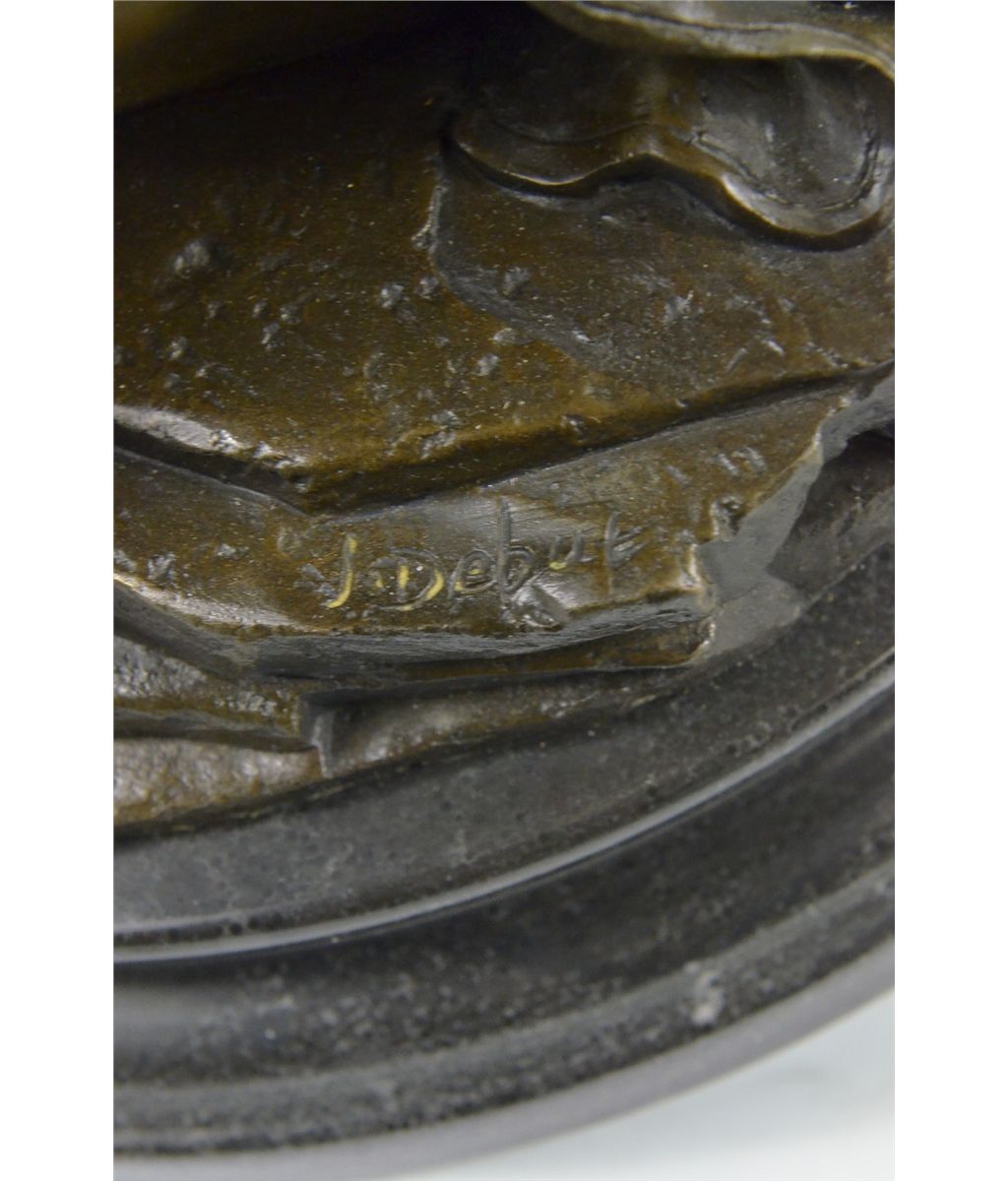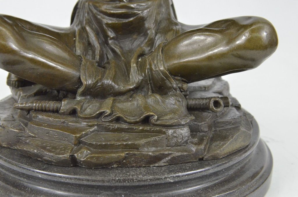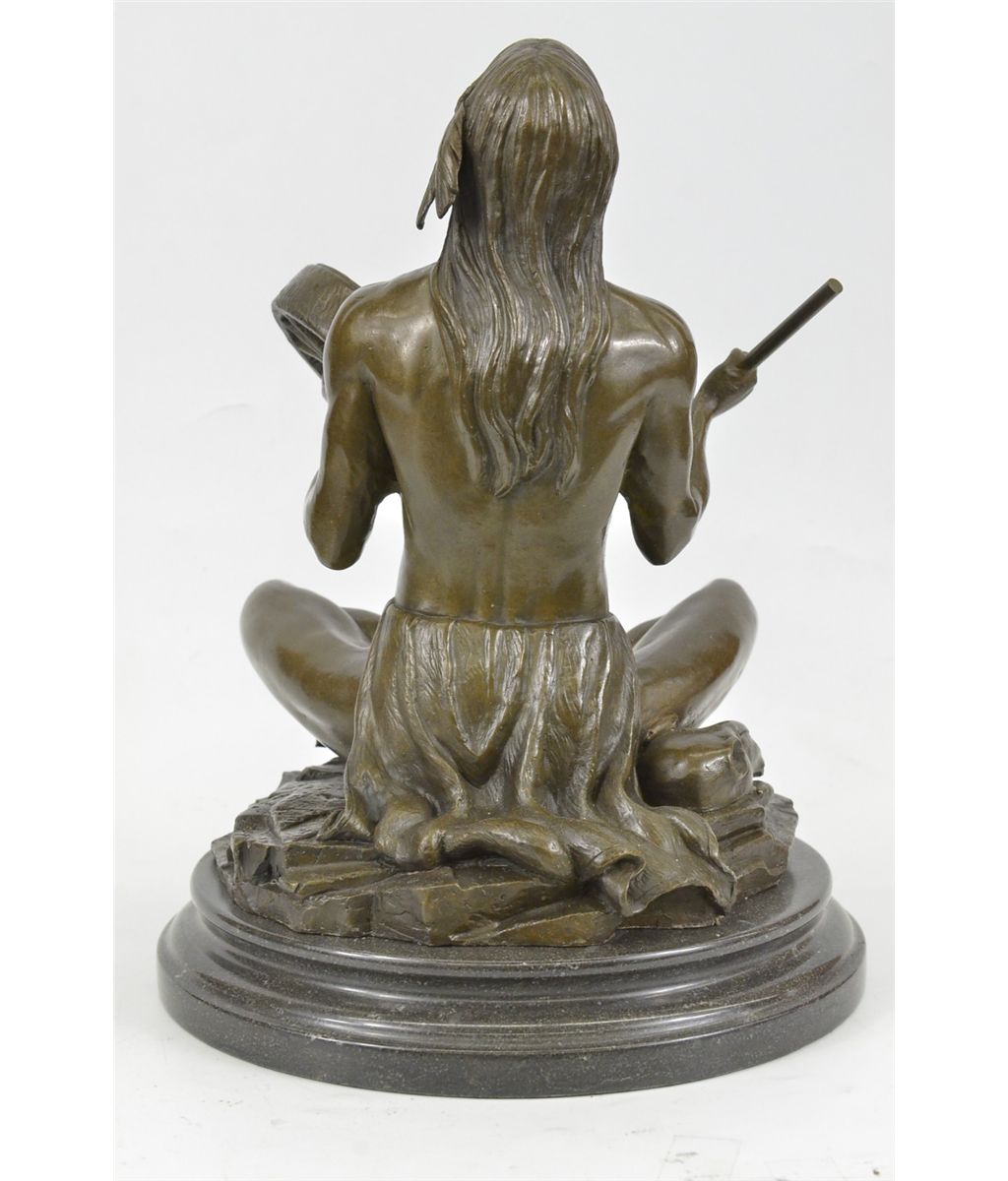 11XN080080 The Shaman Native American Indian Sits Indian-Style, Chanting Prayers, Banging On A Small Hand Drum, In Hopes Of Communicating With The Spirit World. Shamanism Encompasses The Belief That Shamans Are Intermediaries Or Messengers Between The Human World And The Spirit Worlds. Shamans Are Said To Treat Ailments And Illness By Mending The Soul. Alleviating Traumas Affecting The Spirit Restores The Physical Body Of The Individual To Balance And Wholeness.The Texture Of The Sculpture Seems To Capture The Medicine Man In An Interval Dimension Between The Earth And That Of The Spirit World; As Though A Certain Mysterious Vibration Has Taken Hold Of Him, Blurring The Distinction Of The Lines Of His Body. The Handmade Bronze Sculpture Was Molded Using The Archaic Method Of Lost-Wax Casting And Stained With A Brown Patina Finish For Preservation. It Is Mounted Upon A Black Marble Base With The Artist J.Debut'S Signature...................SHIPPING USA: $25....HI, ALASKA, CANADA: $79...ALL OTHER COUNTRIES: $189