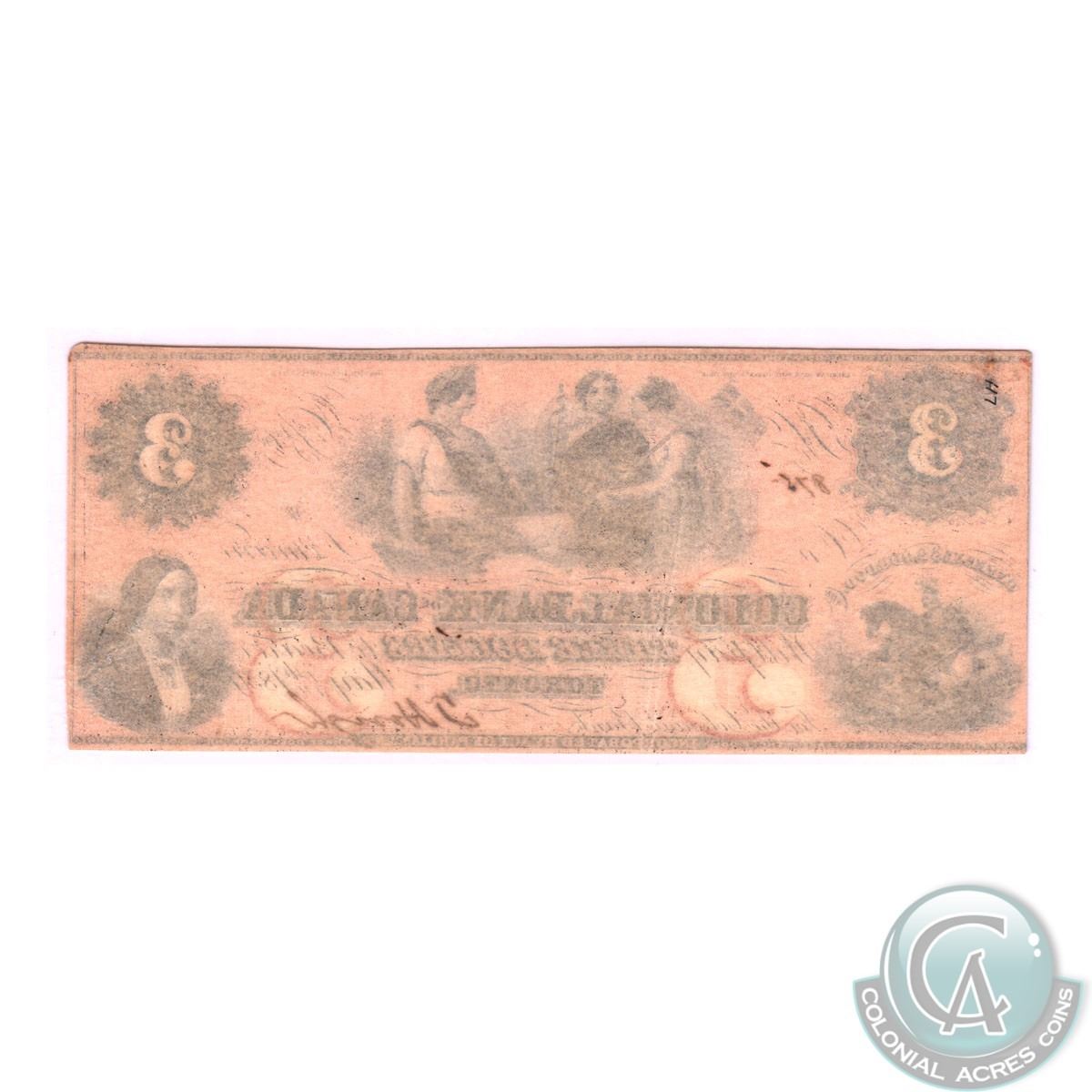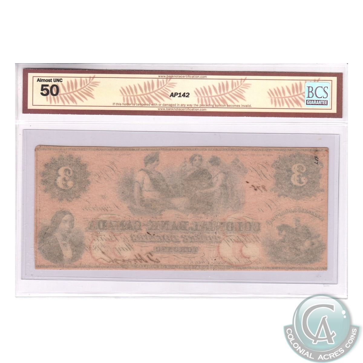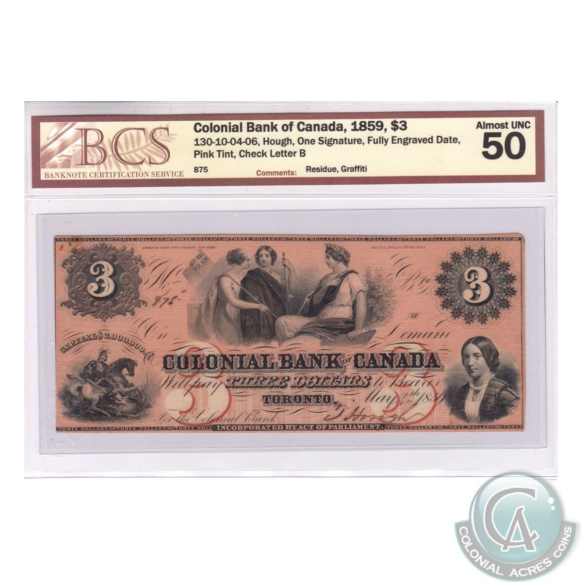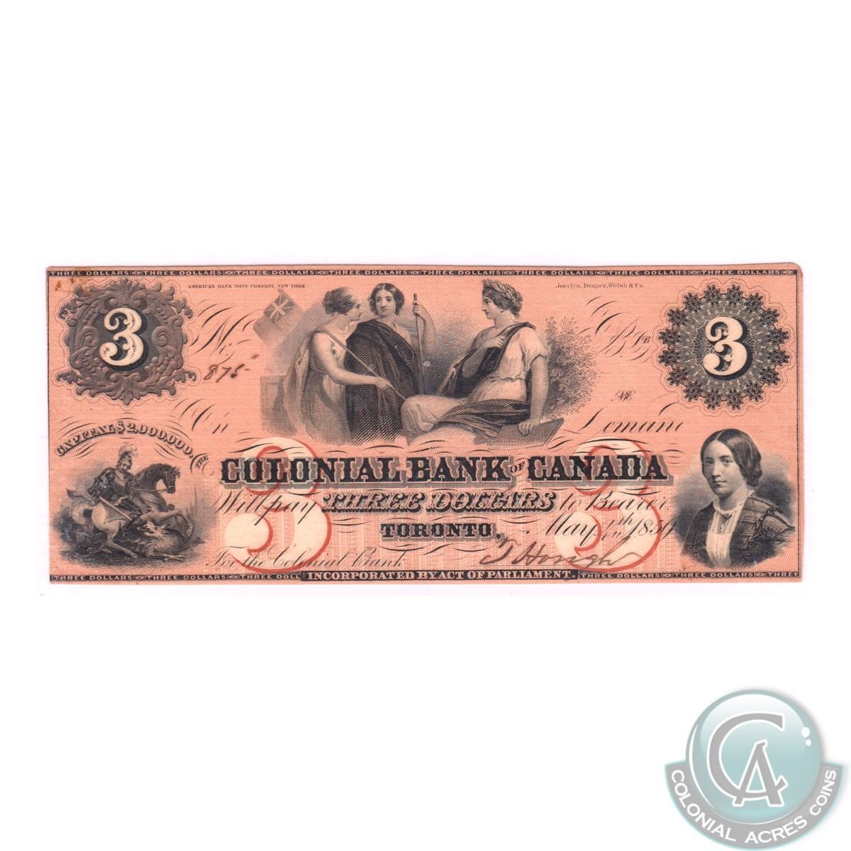 130-10-04-06. 1859 Colonial Bank of Canada $3. Hough (one Signature), Fully Engraved Date, Pink Tint. S/N:875/B. BCS Certified AU-50 (Minor residue, and small writing on reverse "H7")
