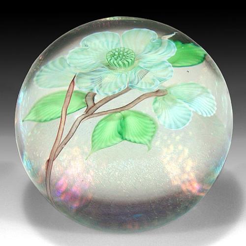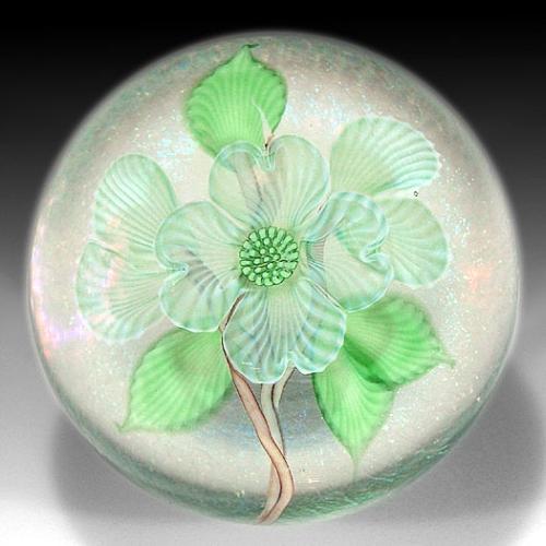 Orient & Flume Art Glass miniature compound dogwood paperweight, with a white dogwood blossom, two buds, and pale green leaves, over a translucent iridescent cushion. Limted edition #112 of 250. G. Jones, artist. Signed. Diameter 2 3/8". NO RESERVE