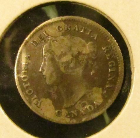 1874 plain 4 small date Canada Five Cent Silver, F, value $75