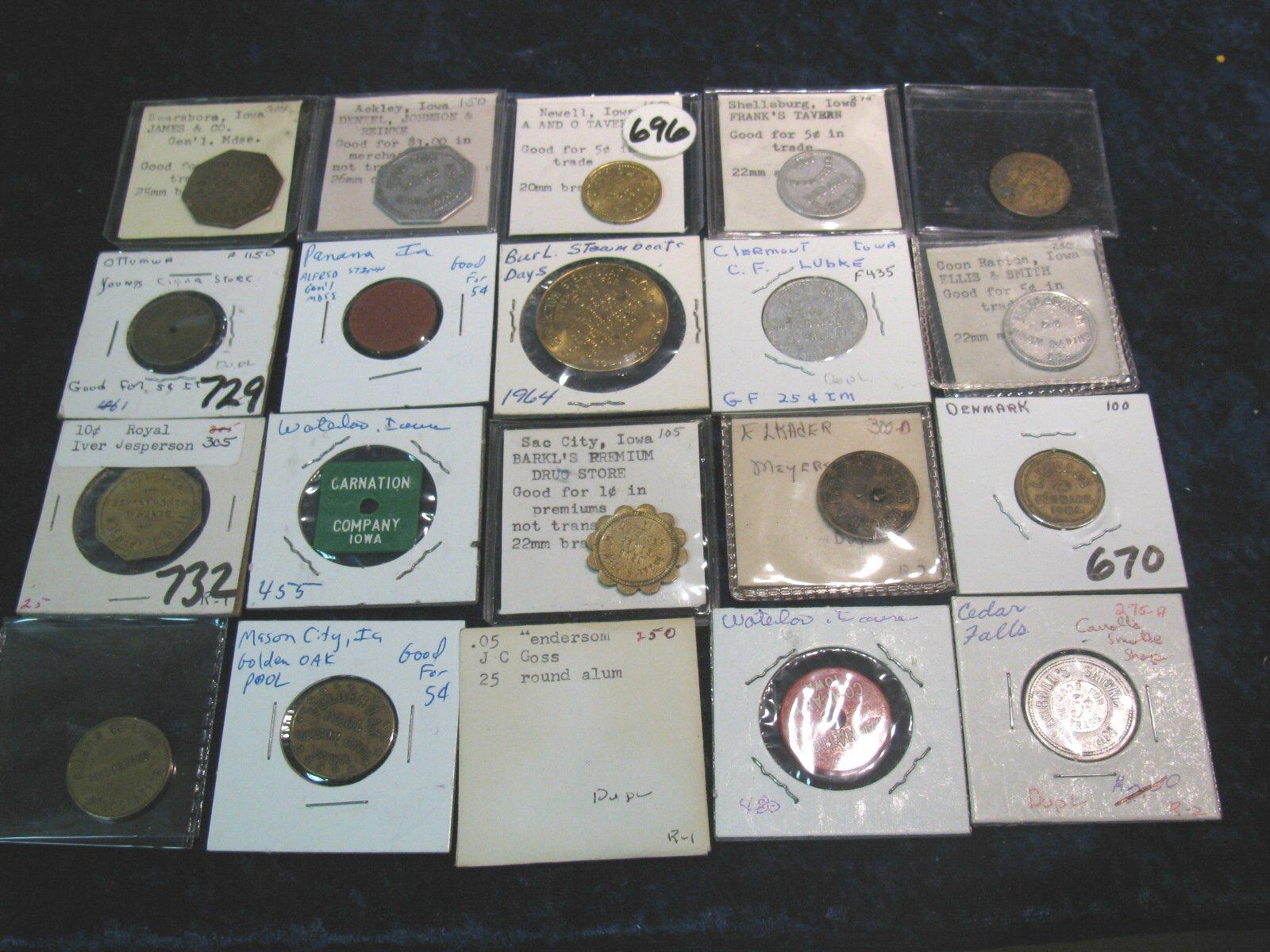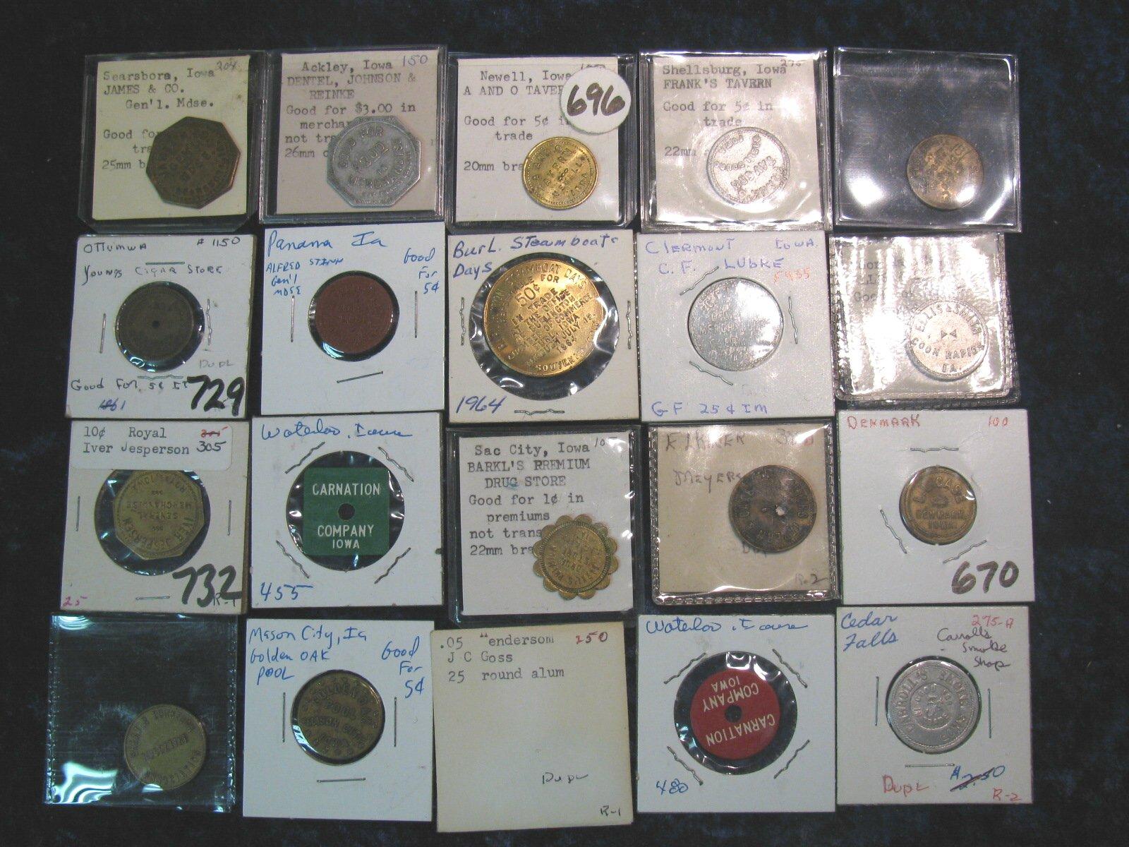 1300. (20) Rare Iowa Good For Tokens in this collection. Includes: Burlington, Panama, Shellsburg, Newell, Waterloo, Henderson, La Porte City, Mason City, Muscatine, Royal, Ackley, Cedar Falls, Elkader, Sac City, Searsboro, Coon Rapids, Clermont, Ottumwa, & Denmark, Iowa.