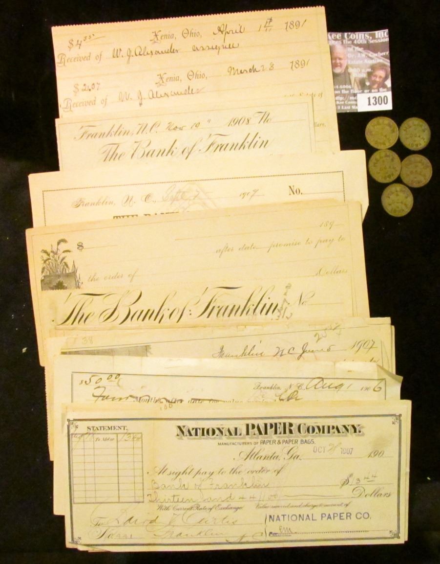 (5) 10c Good in Trade Tokens from "Helm's/Logan, Iowa"; Pair of 1891 Receipts Xenia, Ohio signed by the Probate Judge J.M. Stuart; and a large group of North Carolina receipts and checks including one drawn on "The Bank of Franklin". Doc sold each of these as priced.