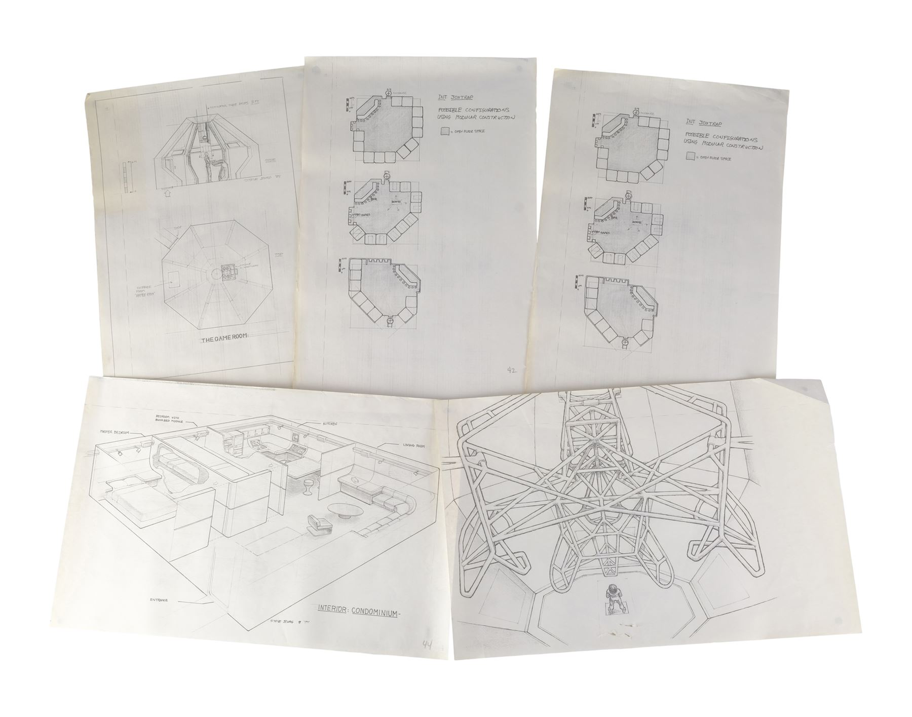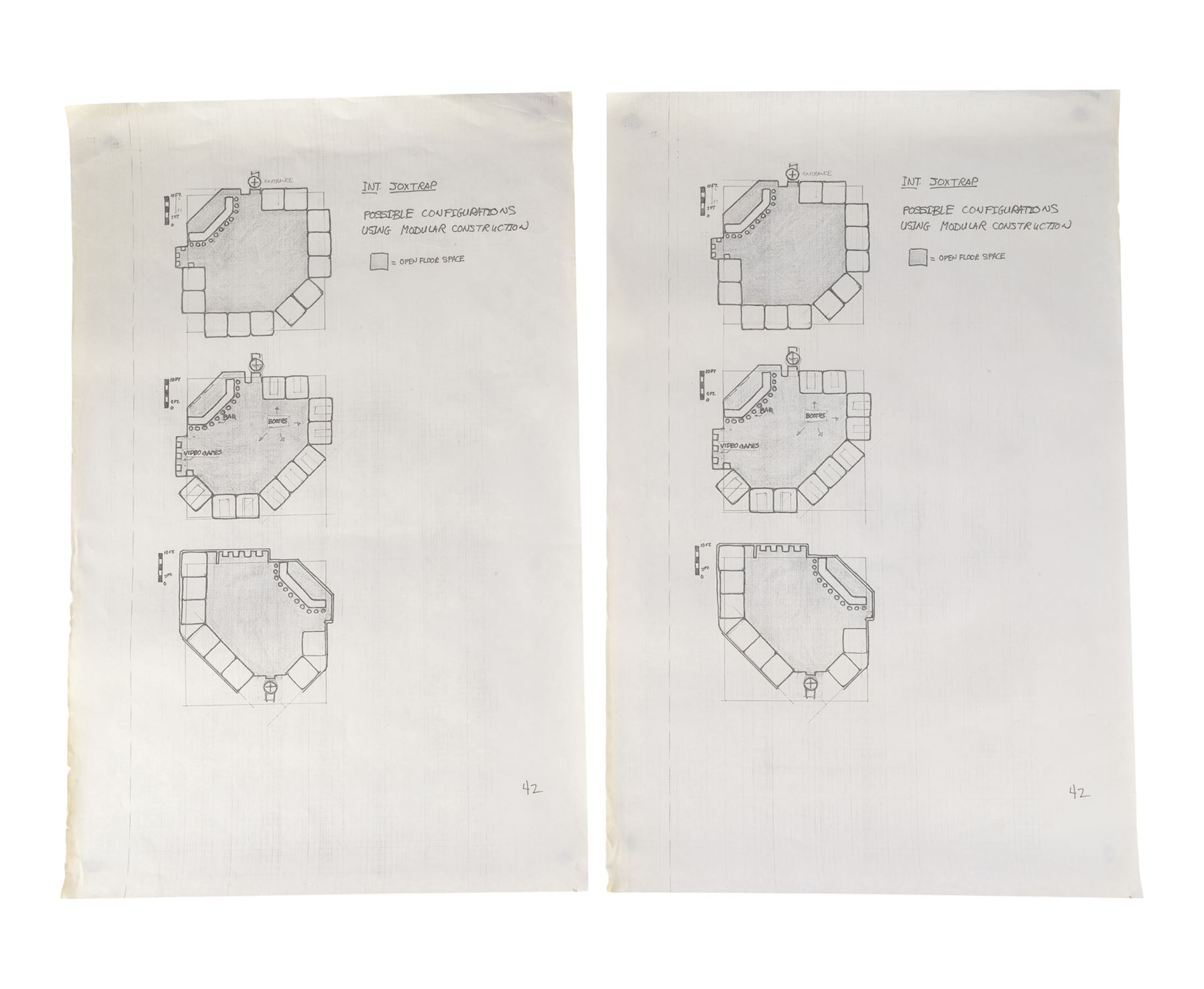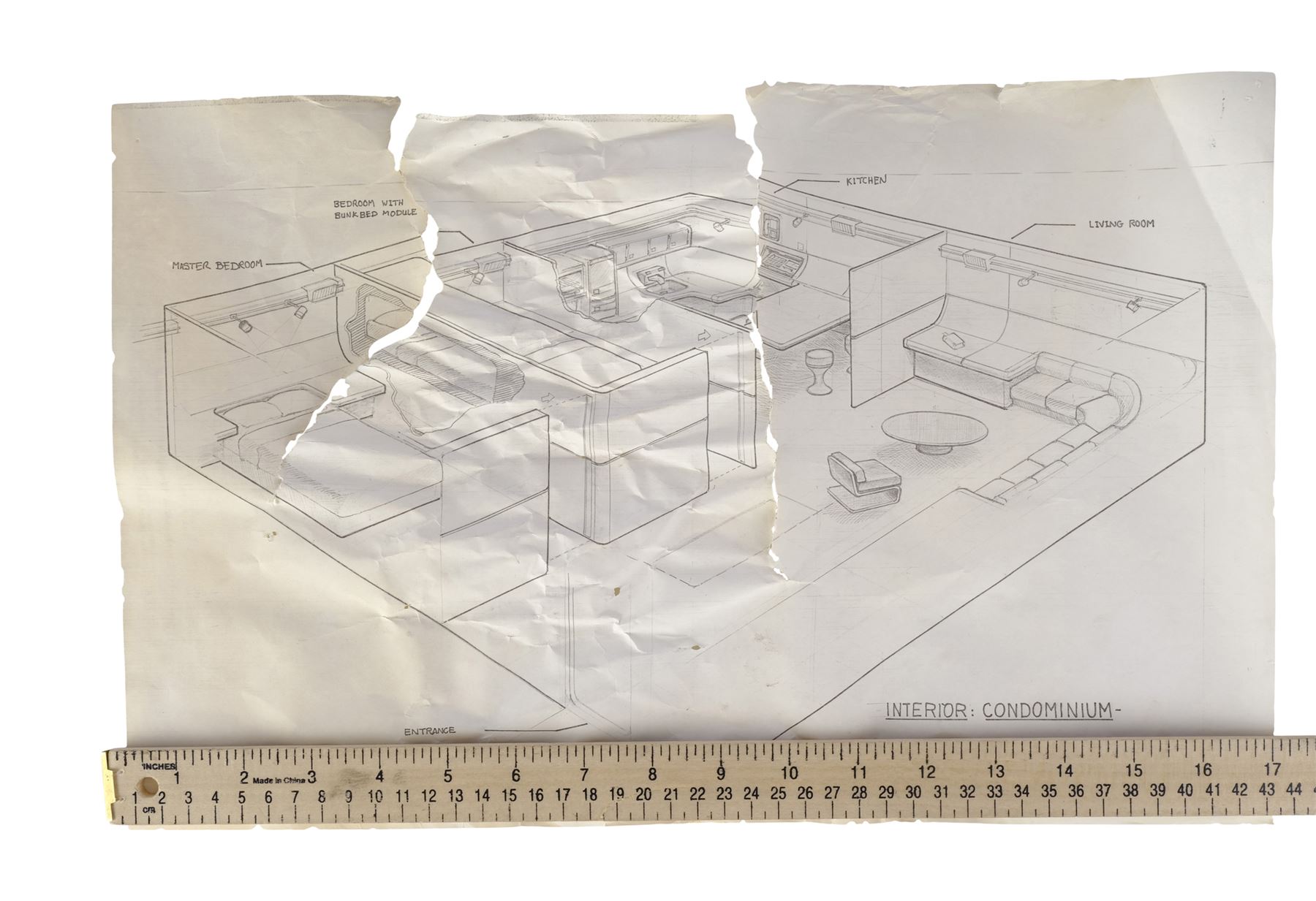 Created by conceptual designer Steve Burg, this lot consists of 11 printed concept designs for the Joxtrap with modular constructions, Game Room, and a condominium. Some of the designs feature Burg's printed signature on them. These concept prints exhibit curling, discoloration, as well as one print ripped and wrinkled. Dimensions: (largest) 11" x 17" (28 cm x 43.25 cm)