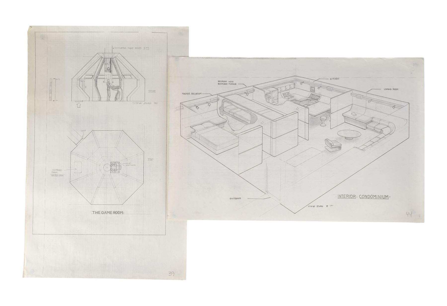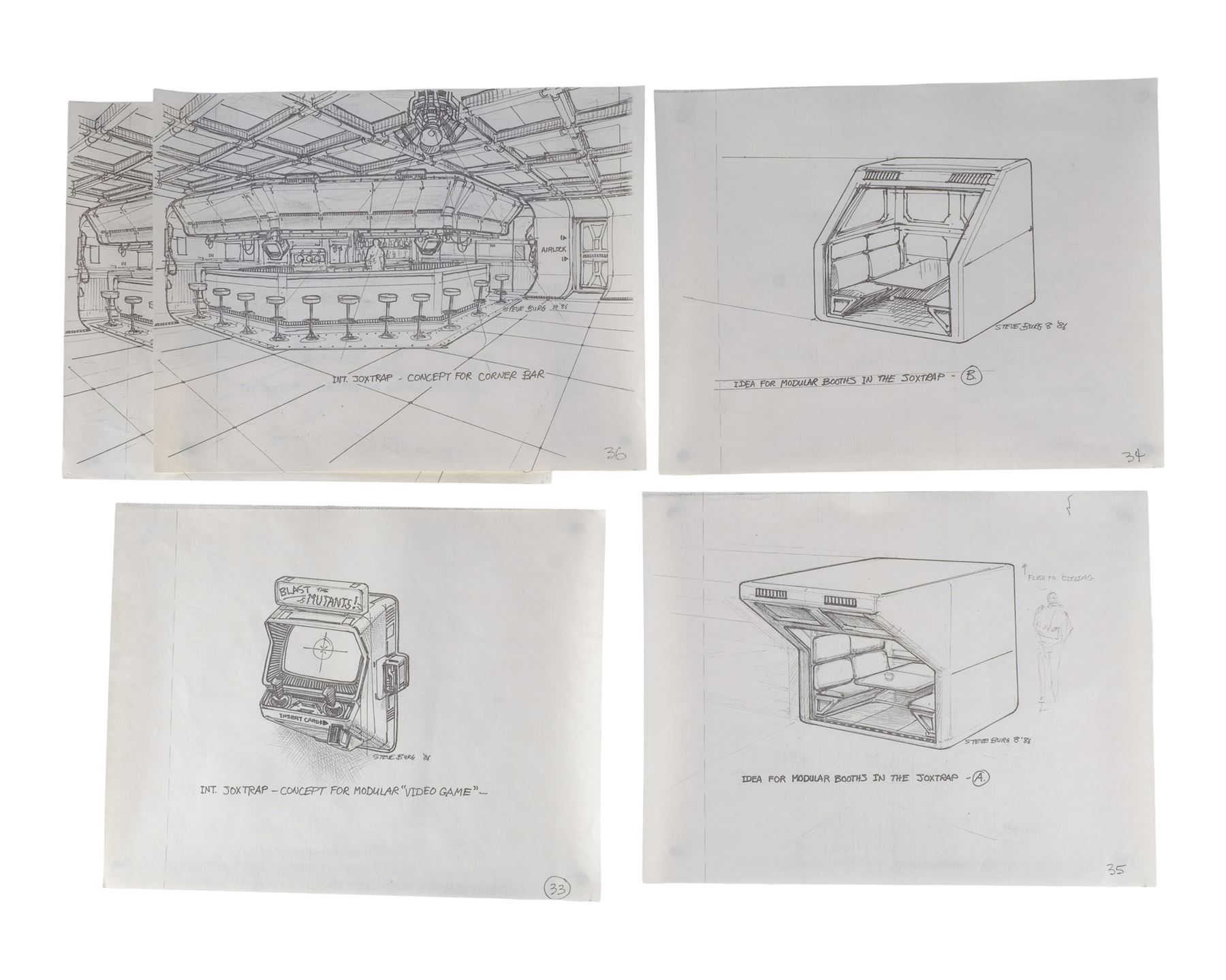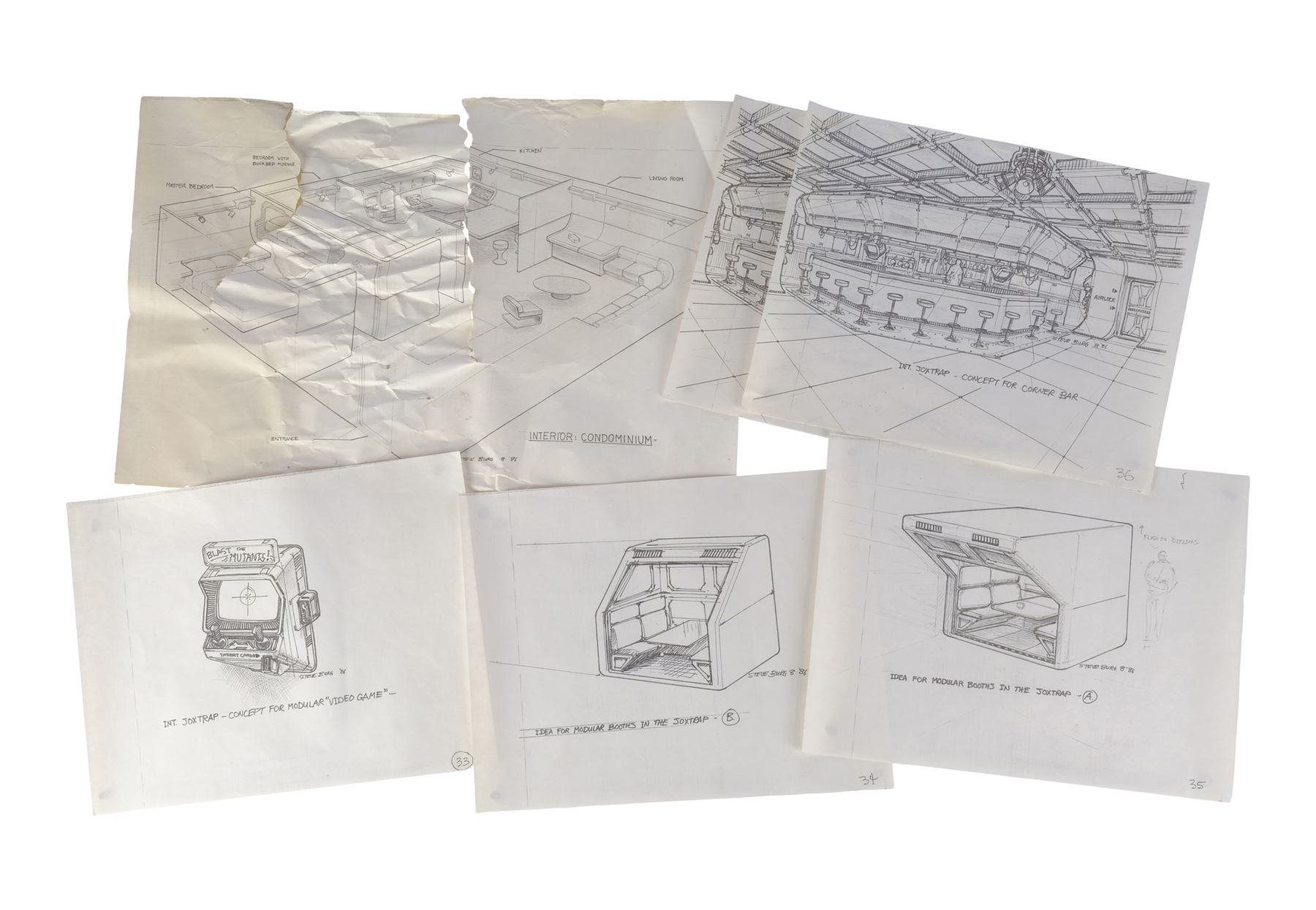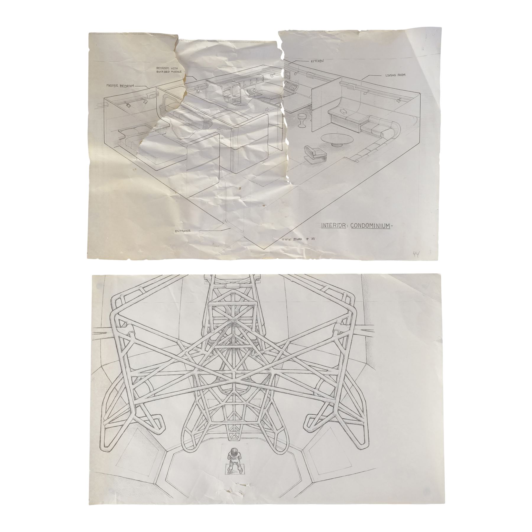 Created by conceptual designer Steve Burg, this lot consists of 11 printed concept designs for the Joxtrap with modular constructions, Game Room, and a condominium. Some of the designs feature Burg's printed signature on them. These concept prints exhibit curling, discoloration, as well as one print ripped and wrinkled. Dimensions: (largest) 11" x 17" (28 cm x 43.25 cm)