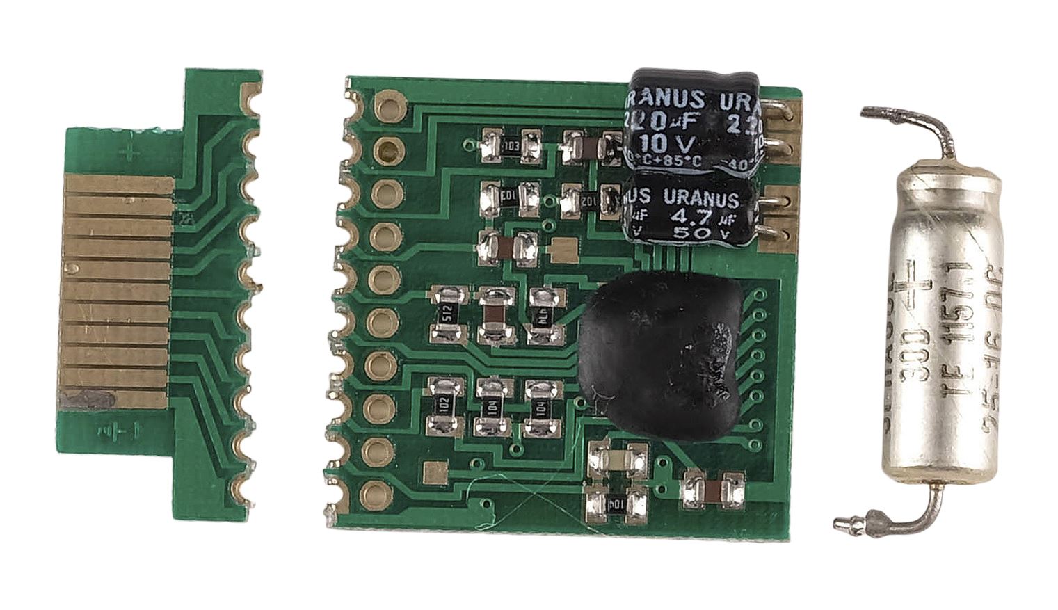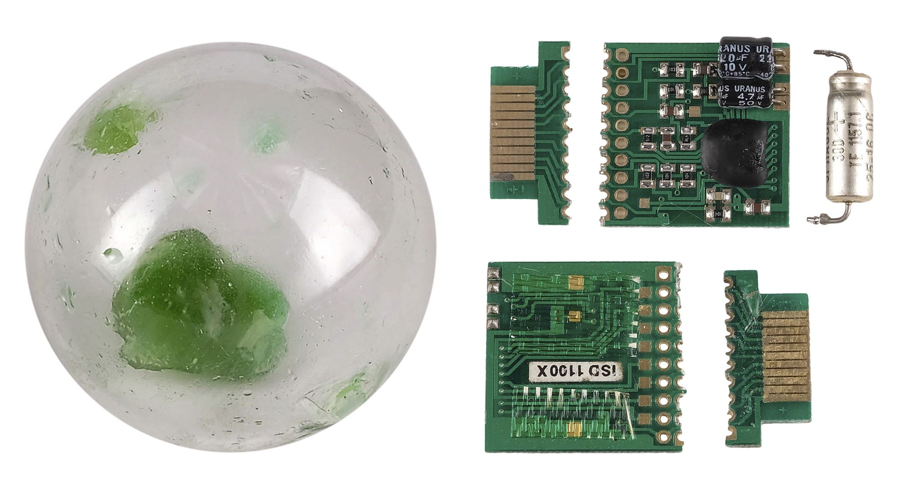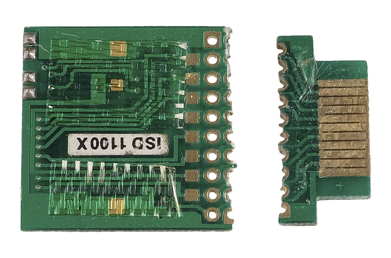 This metal and plastic chip comes in two parts: one larger and mounted with static capacitors, and one smaller and flatter. Both pieces are distressed by production to appear snapped through their centers. They exhibit uneven edges and have no functionality. Dimensions: 1" x 1" x 0.25" (2.5 cm x 2.5 cm x 0.75 cm)
