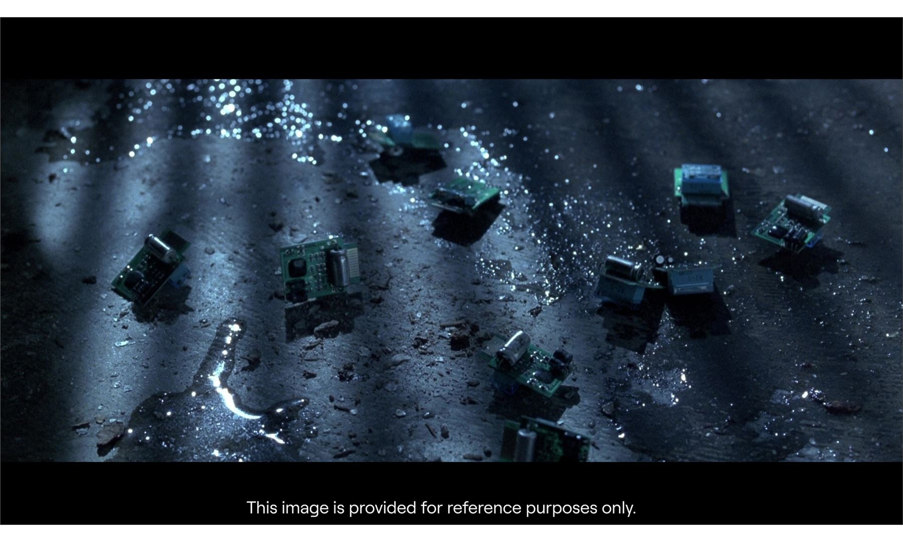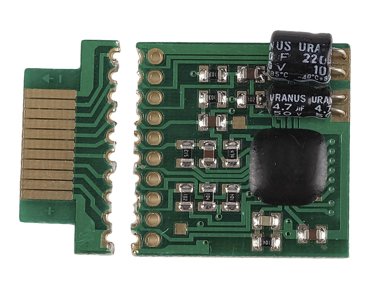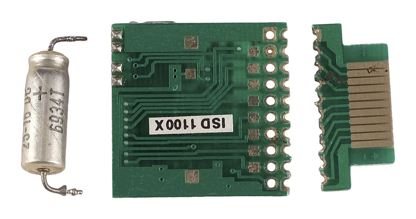 This metal and plastic chip comes in two parts: one larger and mounted with static capacitors, and one smaller and flatter. Both pieces are distressed by production to appear snapped through their centers. They exhibit uneven edges and have no functionality. Dimensions: 1" x 1" x 0.25" (2.5 cm x 2.5 cm x 0.75 cm)