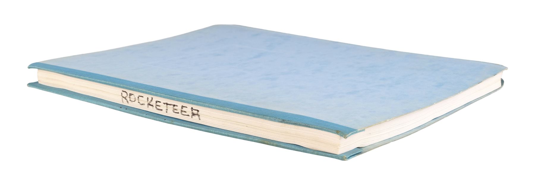 The script is bound in blue card, 122 pages long, and features the Rocketeer logo on the title page and "Rocketeer" handwritten in black ink across the fore-edge. Dimensions: 9.25" x 11.5" x 0.75" (23.5 cm x 29.25 cm x 2 cm)
