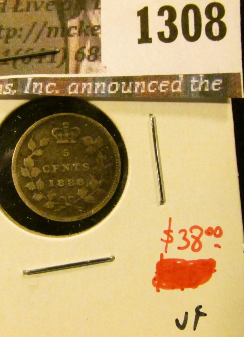 1308 . 1888 Canada Five Cent Silver, VF, value $38