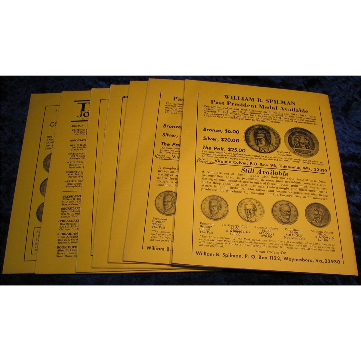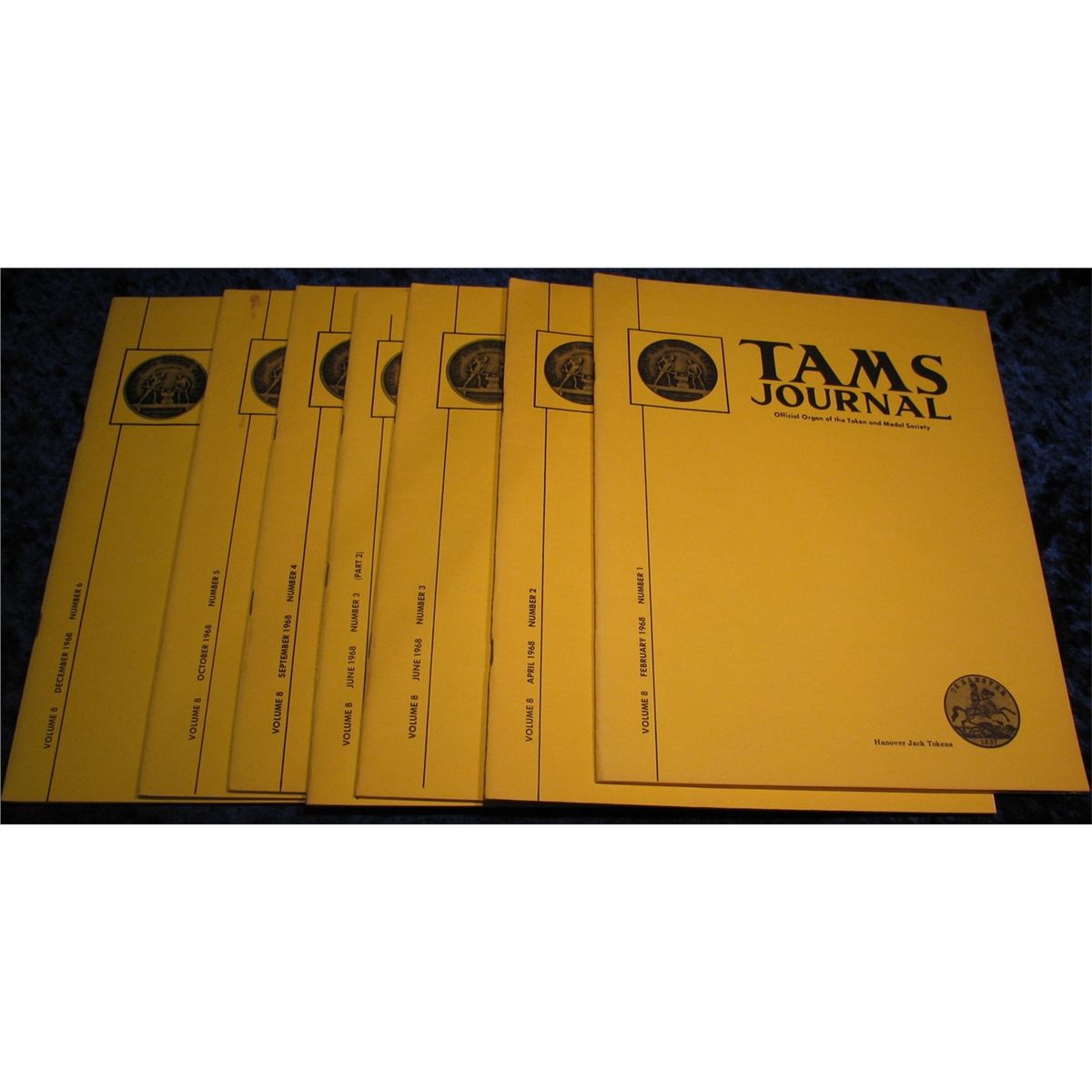 1308. 1968 "Tams Journal" Magazines. Volume 8 no. 1-6. Includes some of the best research in the world on Hanover Jack Tokens, Lewis & Clark Exonumia, C.N.A. Medal Catalogues, Lafayette Medals, & Impact Tokens.