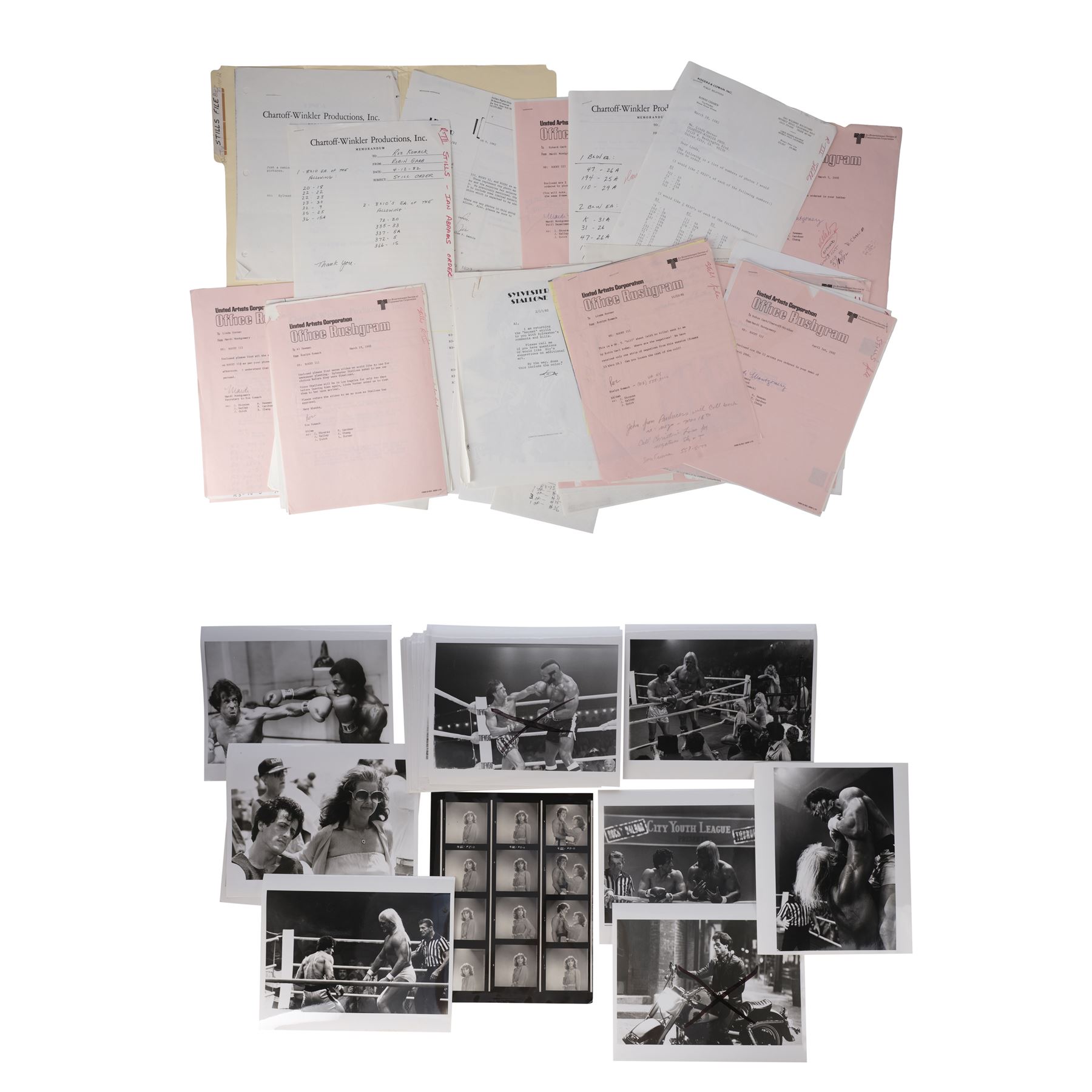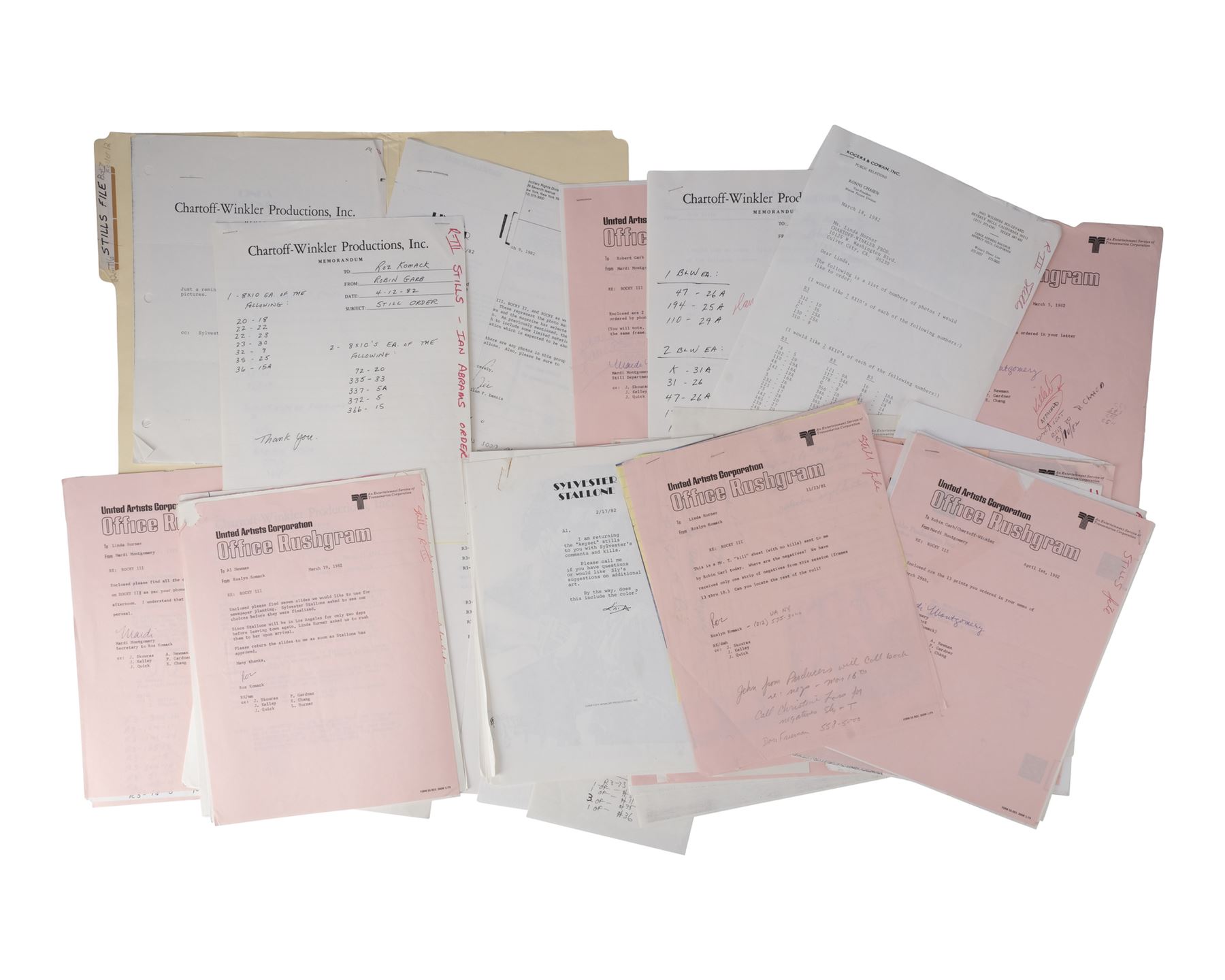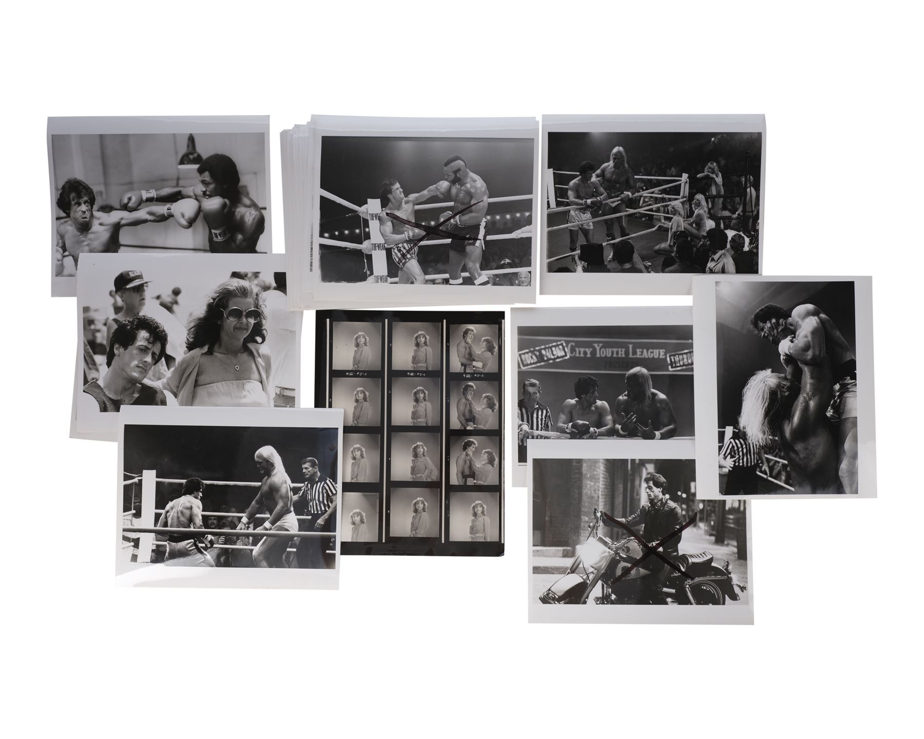 ROCKY III (1982) - Collection of Photographs and Paperwork - A collection of photographs and paperwork from Sylvester Stallone's Rocky III. This lot consists of eight black-and-white photo stills; 32 black-and-white stills, each with an "X" handwritten on the front, and a 35mm color slide marked "R III - C-4" in an MGM gray envelope marked "Rejected Stills Linda Horner X Ordered By I. Abraus"; 123 pages of paperwork, correspondence, handwritten notes, and printed and production-made photo stills. This lot exhibits curling to the still and page wrinkles and creases. Dimensions: (largest) 8.75 cm x 12" x 0.5" (22.25 cm x 30.5 cm x 2.75 cm)