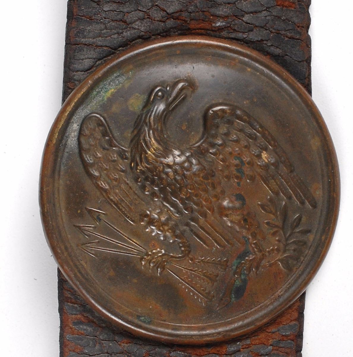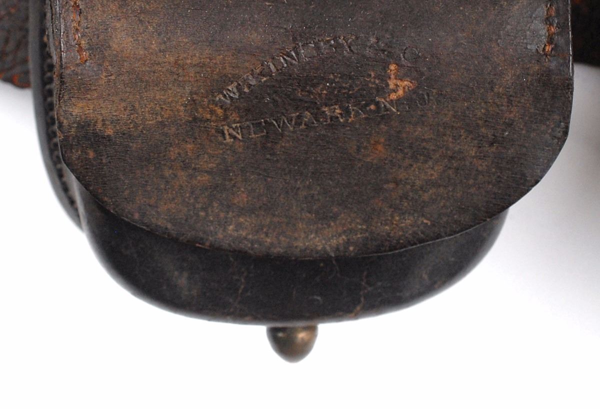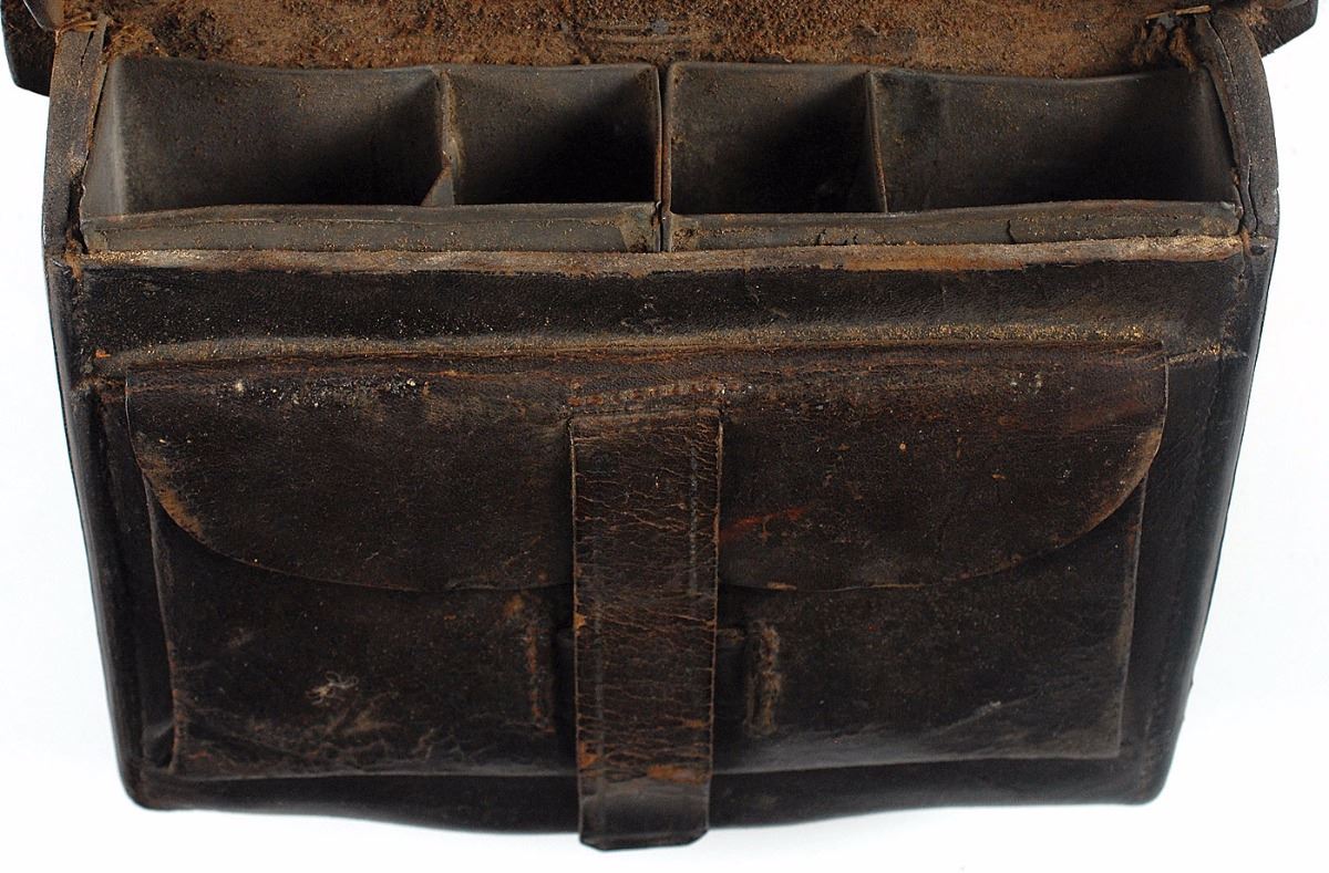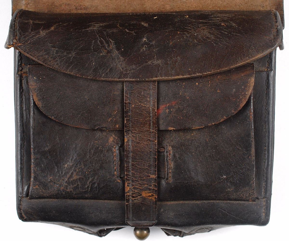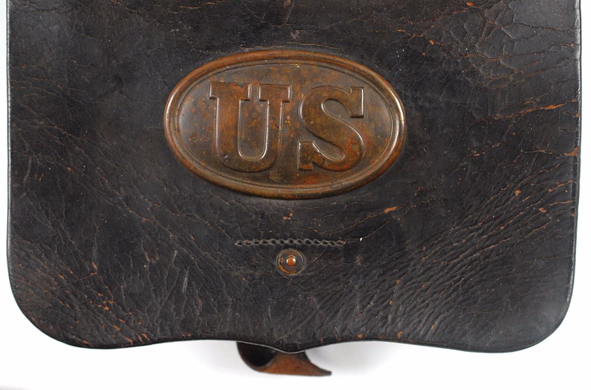 Federal pattern infantryman’s M1864 .58 caliber cartridge box carried by Union soldier Adam Fitzkee of the Pennsylvania Volunteers, identified on a period pasteboard card enclosed in the implement pouch reading, “Cartridge Box used by Adam Fitzkee.” The black bridle leather accouterment set is complete with the M1864 cartridge box, sling, and attached percussion cap box. The cartridge box measures approximately 8 x 6.5 x 2 and retains both original inner two-compartment tins, all inner flaps and tabs, brass oval “US” plate adorning the main flap, and both roller buckles and finial. Crisply impressed on the top of the inner flap is the maker’s stamp, “H. W. Oliver, Pittsburg, PA.” The leather shoulder strap is stamped “Boyd & Sons, Boston,” and is complete with both sets of leather billets intact. An attractive circular brass Eagle breastplate decorates the sling, and the leather percussion cap box is attached with two leather loops on the back; a maker’s mark, “W. Kinsey & Co, Newark, NJ,” is stamped on the top of the inner percussion cap box flap, and the box retains its original fleece and pink. All stitching is original and tight. Some flaking and cracking to the sling, otherwise overall fine condition. Impressively well-preserved with great visual appeal. Provenance: The Horse Soldier. Accompanied by a packet of photocopied records detailing Fitzkee’s military service. Fitzkee served two stints in the Union Army, first in Company B, 130th Pennsylvania Volunteers from August 1862 until March 1863. During this period he received a scalp wound at Antietam while charging an enemy position near the sunken road. He reenlisted in February 1865, this time serving in the 195th until January 1866.