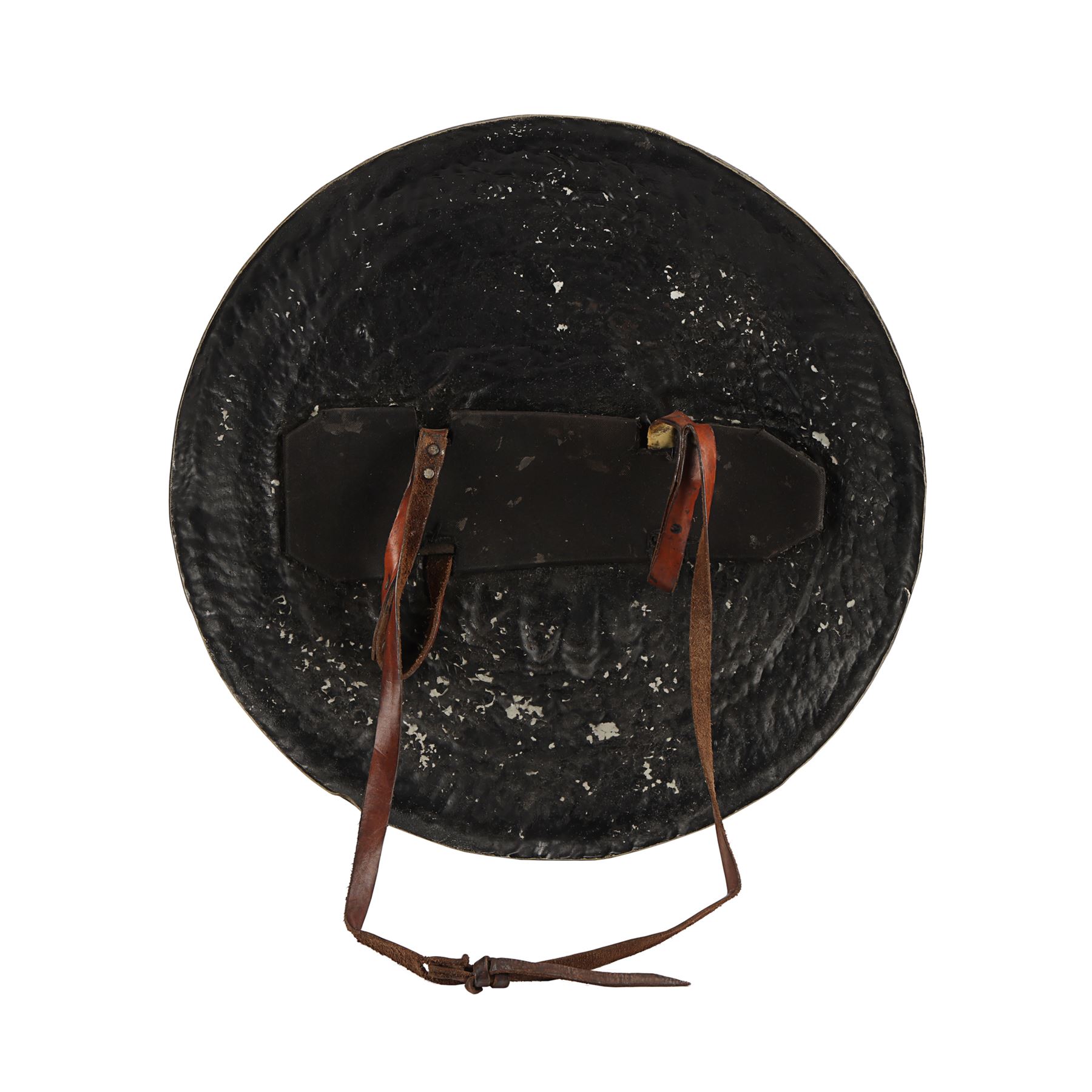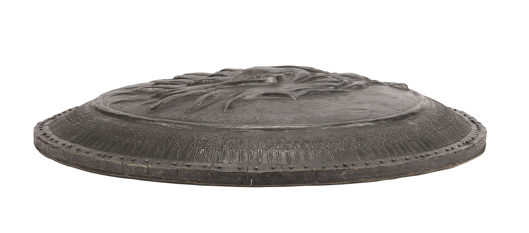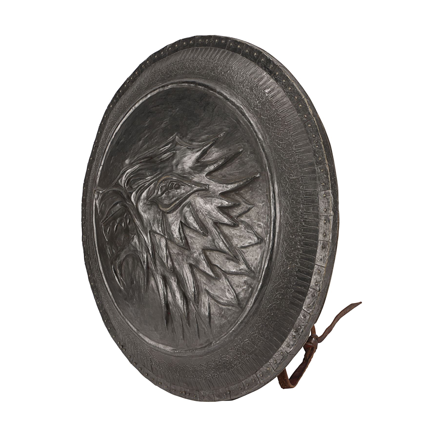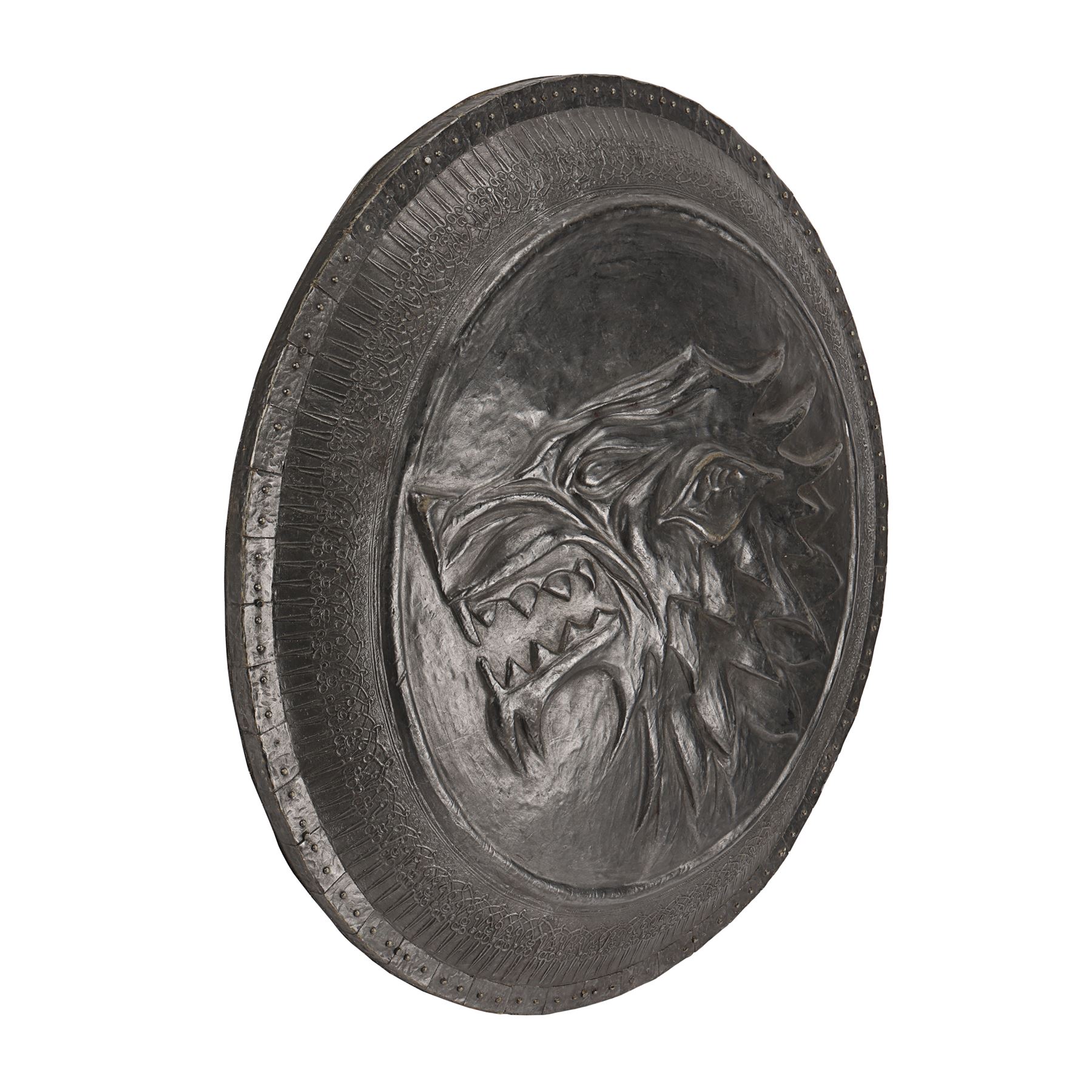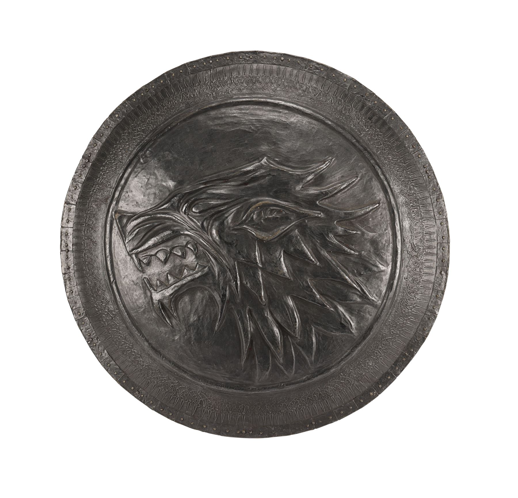 GAME OF THRONES (T.V. SERIES, 2011-2019) - House Stark Direwolf Shield - A House Stark shield from the fantasy television series Game of Thrones. Stark household men carried shields embossed with the sigil of the Stark house, the direwolf, to indicate their allegiance. The shield is made of hard rubber, and painted to resemble metal. The front of the shield is molded with the shape of the Stark direwolf. Leather straps on the interior of the shield facilitate wearing it on the arm, along with a foam backing for the comfort of the wearer. The interior of the shield exhibits some paint damage. Dimensions: 23.75" x 23.75" x 3.5" (60.5 cm x 60.5 cm x 9cm)