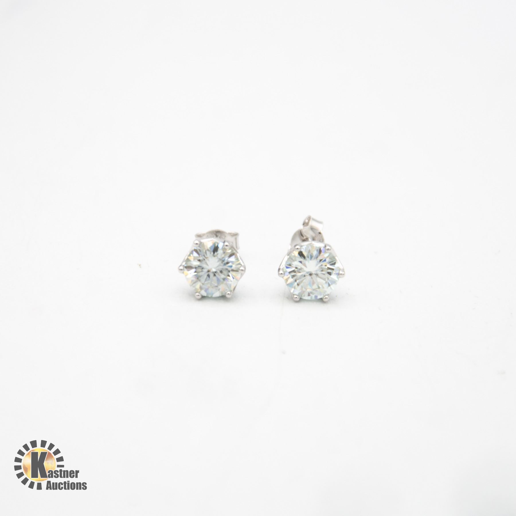 ROUND BRILLIANT CUT MOISSANITE STONES VVS D COLOR SET IN CENTER OF FANCY 6 CLAW HEAD SET IN 925 SILVER EARRINGS COMES WITH GIFT BOX
