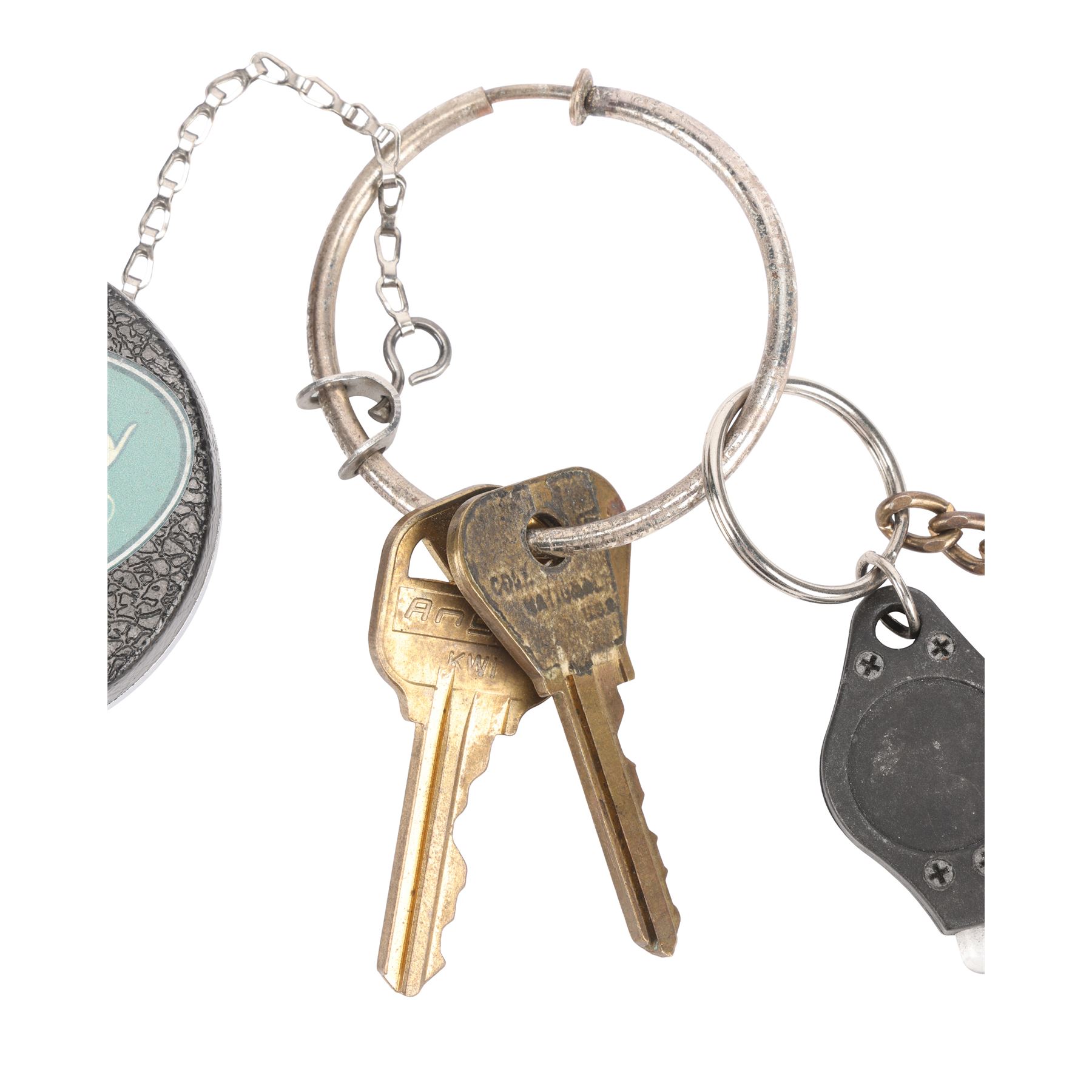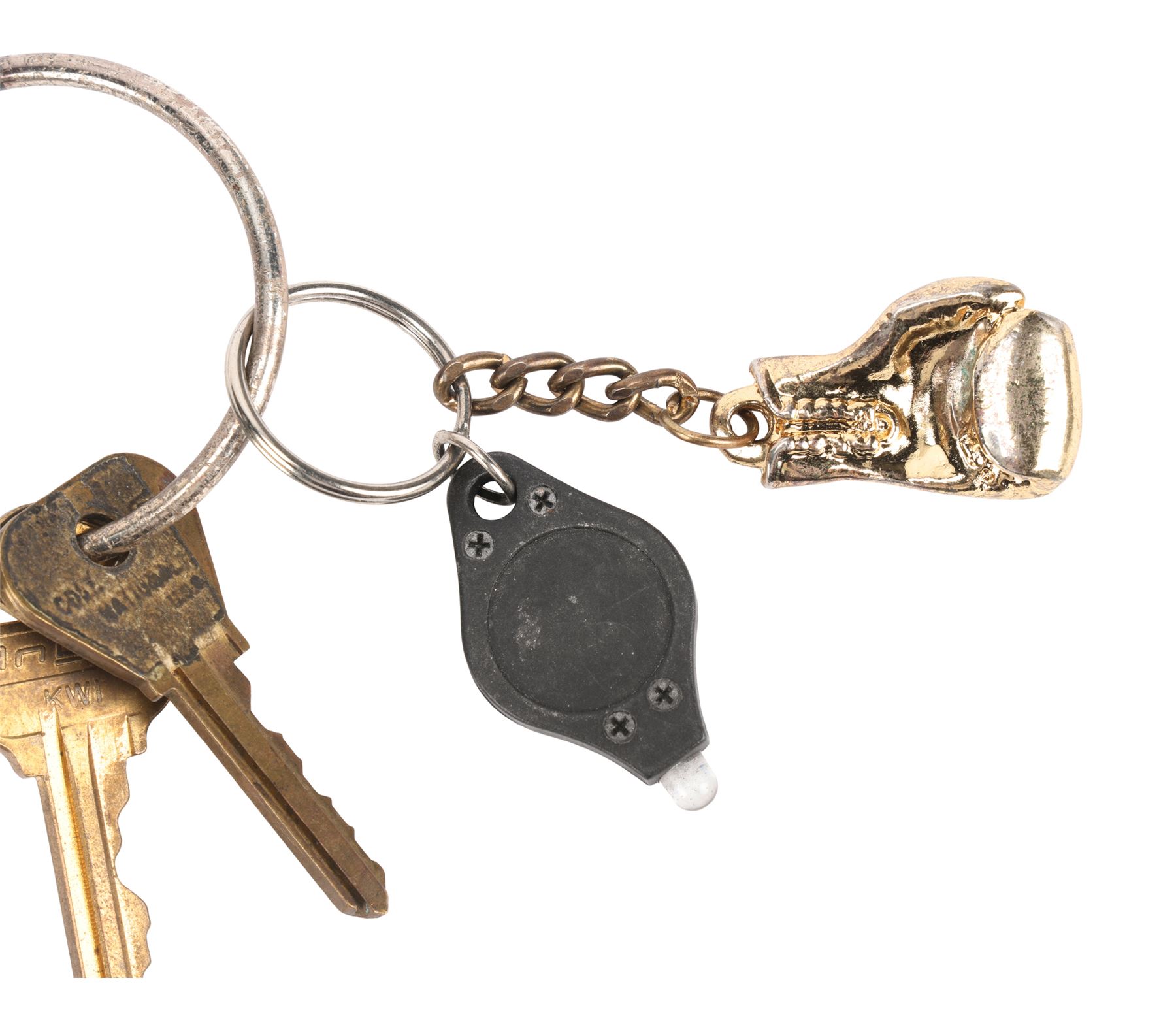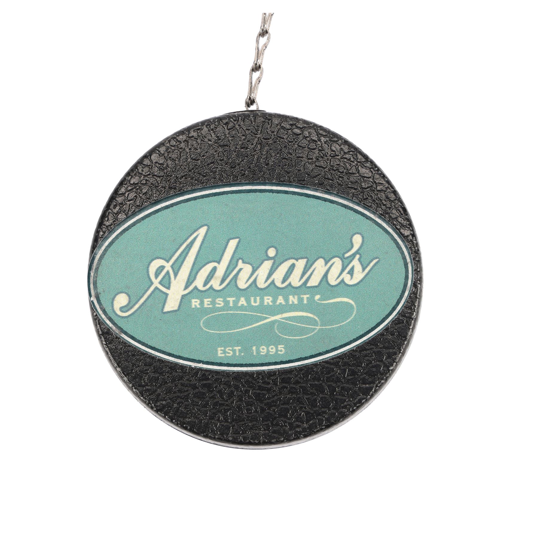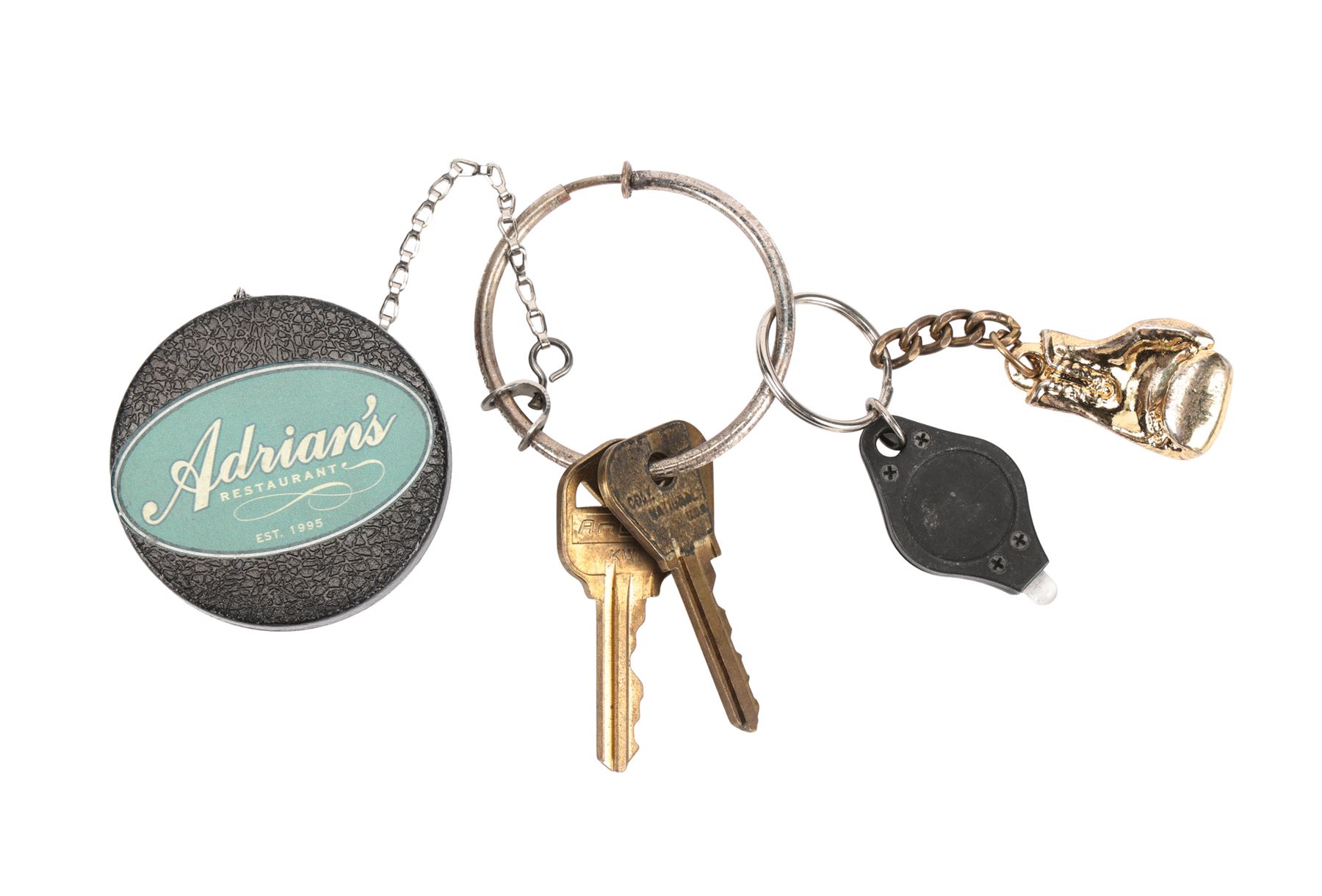CREED (2015) - Rocky Balboa's (Sylvester Stallone) Keychain - Rocky Balboa's (Sylvester Stallone) keychain from Ryan Coogler's boxing drama Creed. Although not obviously seen on screen, the keys are attached to a retractable chain adorned with a sticker for Rocky's restaurant Adrian's, named after his late wife. Also attached to the chain are a small LED torch and a gold-colored aluminum boxing glove pendant.