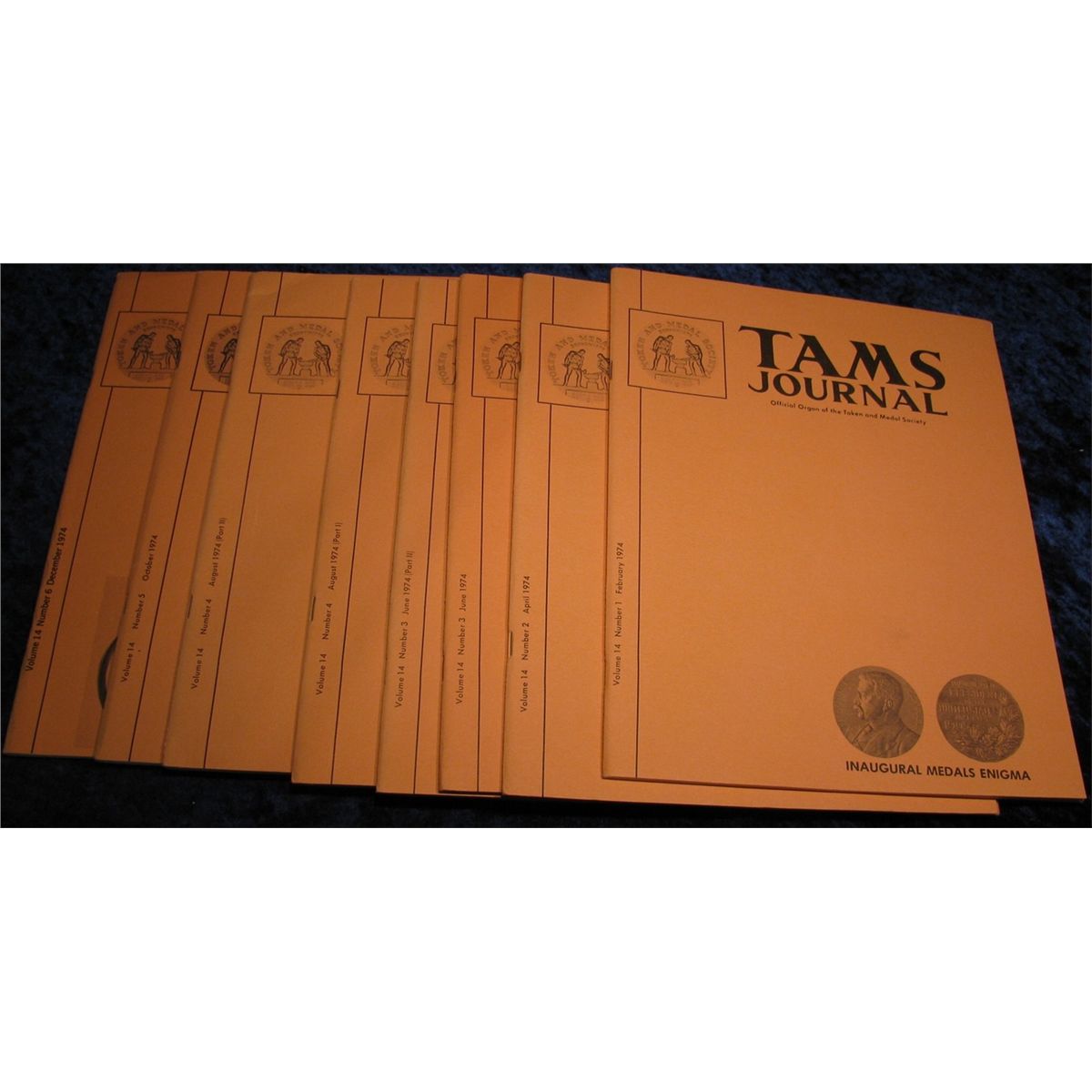 1314. 1974 "Tams Journal" Magazines. Volume 14 no. 1-6. Includes information on Inaugural Medals, Queen City Medals & Tokens, Amusement and Vending Tokens, English Card Counters and more.