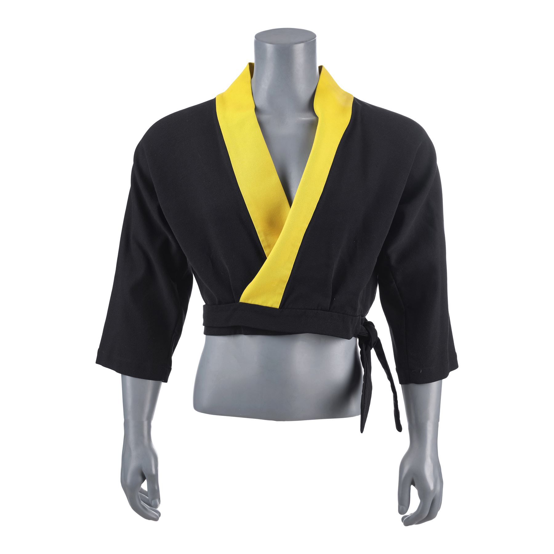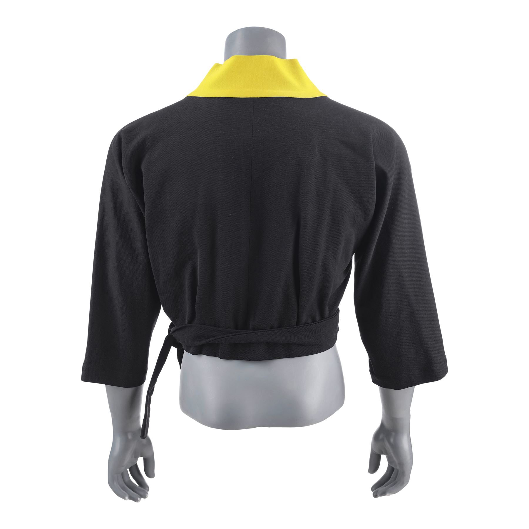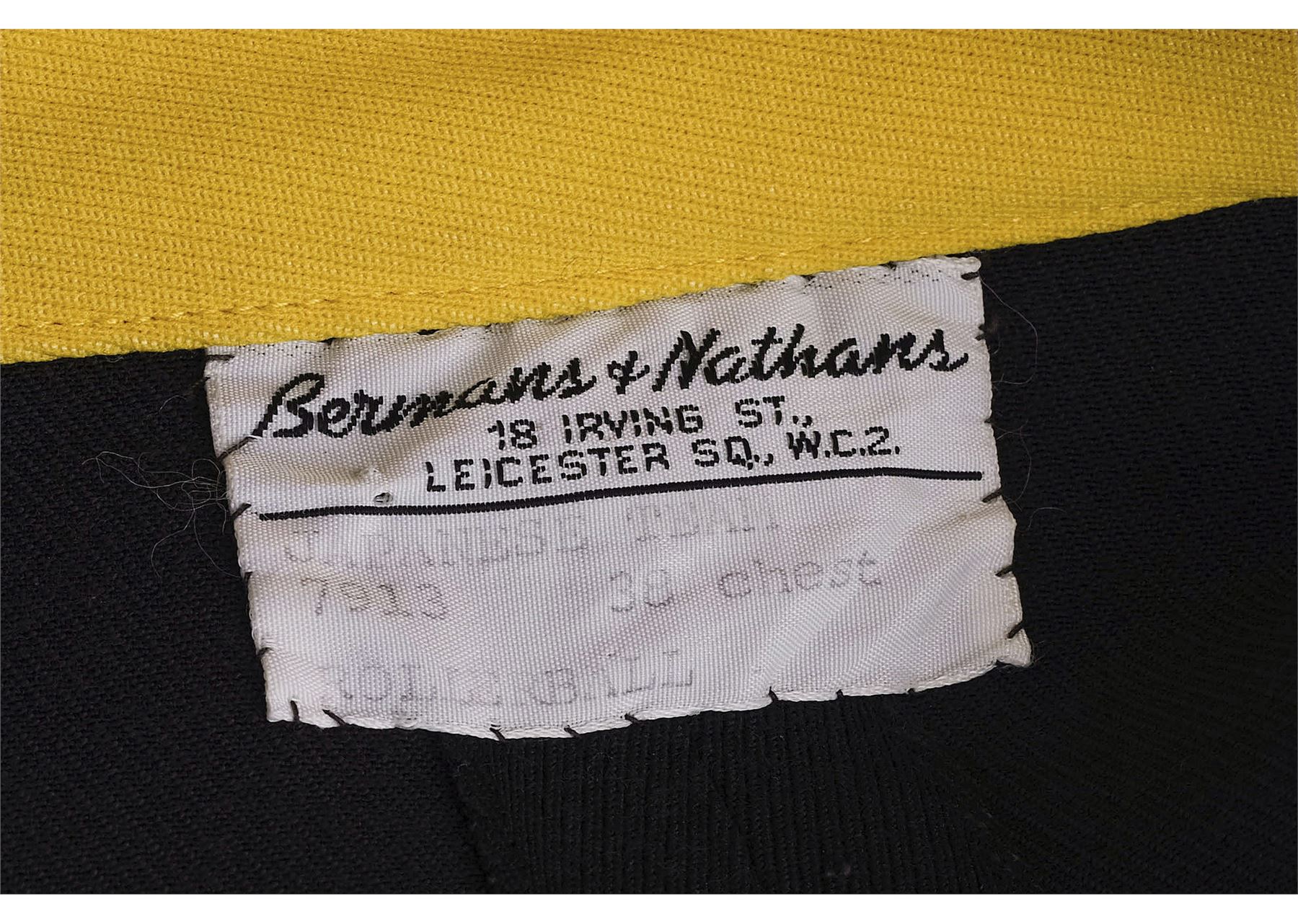 This black and yellow synthetic-blend uwagi-style jacket features an internal Bermans and Nathans wardrobe label printed with "Japanese Team 7913 38 chest Rollerball." The print on the tag exhibits some fading.