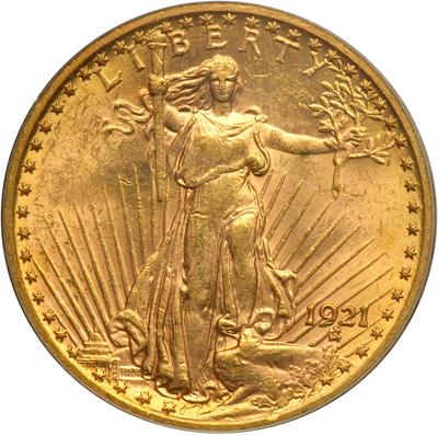 1921 $20 St. Gaudens. PCGS graded MS-62. A frosty mint example with light golden-orange toning. Light chatter marks are noted on both sides, none of which are noteworthy. A naturally toned Brilliant Uncirculated example and well within the narrow margins of the "Choice" category. Gleaming effervescent luster with its wisp toning boosts the visual attractiveness of the coin with its residual cartwheel frost. A few scattered marks as noted are to be found on the obverse, including a small one at the thigh and another in the field to the left of the torch end, while the reverse boasts a much fresher appearance that is almost bereft of marks.