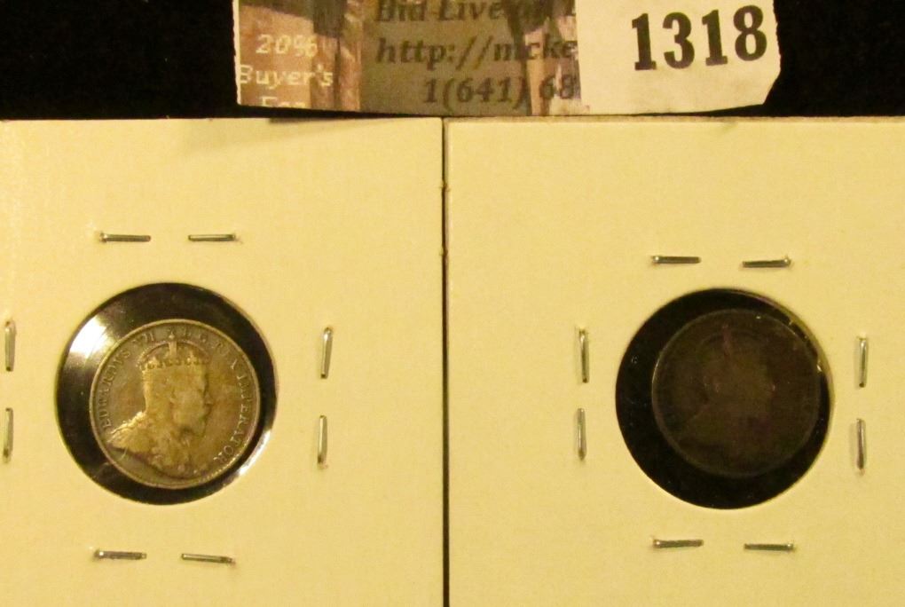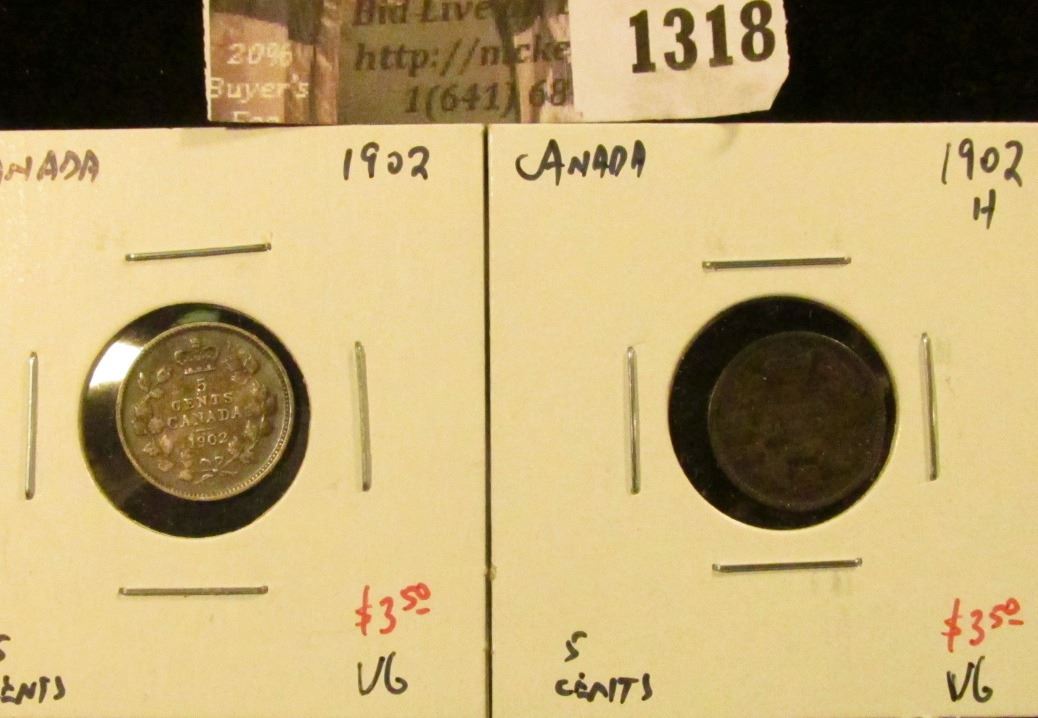 1318 . (2) Canada Five Cent Silvers, 1902 VG, 1902H VG, value for p