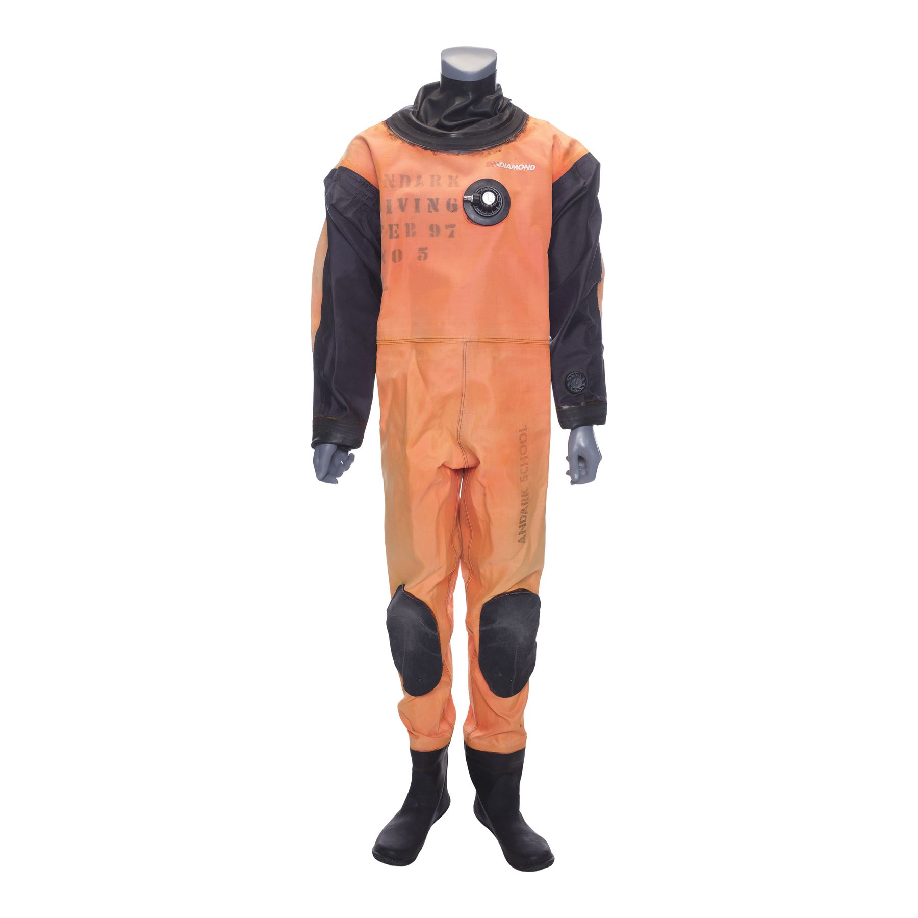 Made for production but ultimately unused onscreen, this black and orange Diamond brand footed dry diving jumpsuit differs slightly from the costume seen in the final cut. It is constructed from a variety of materials and fabrics, including rubber, neoprene, and nylon, and features Andark School stamping on the chest and left leg. The suit exhibits loose threads and tearing, including around the neck.