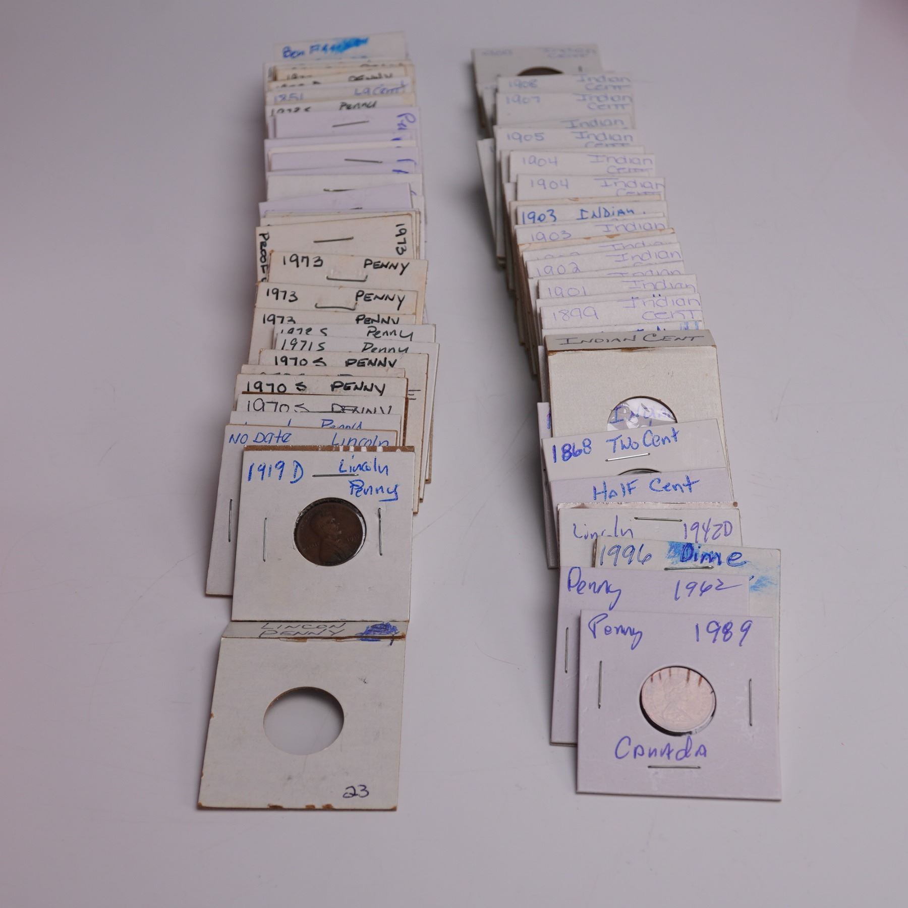 A 131-piece coin collection housed in a red archival storage box. The collection features 50 plastic coin rolls, with 42 rolls partially or fully filled with Lincoln cents in varying quantities. Each roll is labeled for identification and sorting. In addition to the rolls, the lot includes various coins individually mounted in labeled cardboard holders. Highlights include two 1973 Lincoln-Kennedy commemorative cents on illustrated cards noting historical parallels, and a 1993 "Christmas Star" penny in decorative packaging. Also included is a 1943 steel Lincoln cent housed in a red plastic "Good Luck" token with clover motif. U.S. coins in the collection consist of an 1868 Two-Cent piece, a Half-Cent (date not visible. Other U.S. issues include a 1996 Eisenhower Dime, 24 Lincoln cents (Wheat and Memorial types), and 31 Indian Head cents from various years. The international group contains 14 Canadian pennies, including one from 1989, and a 1969 Canadian Nickel. Additional items include a 1996 Republic of Panama one-cent coin, a 2002 Two-Cent Euro coin, and a New York City transit token. A Benjamin Franklin souvenir coin is also present. Coins are stored in a combination of 2x2 holders, plastic capsules, and labeled tubes. The collection spans over a century of North American and international mintages and includes both circulated and uncirculated examples. Box 1: 8.5"L x 2.75"W x 3"H. Box 2: 10.25"L x 5.25"W x 3.5"H.