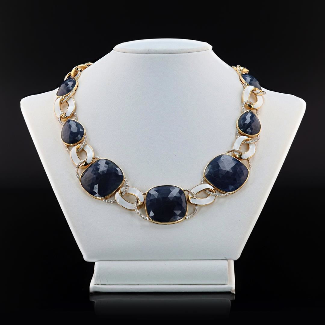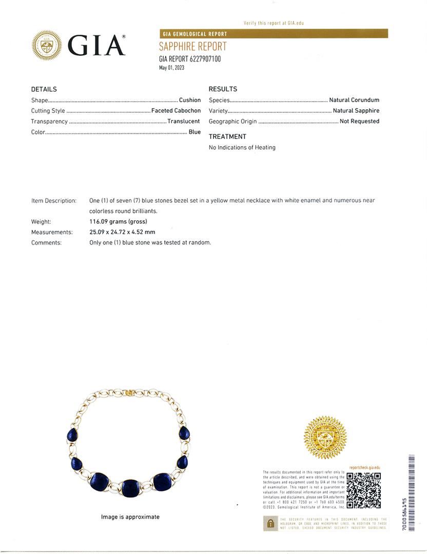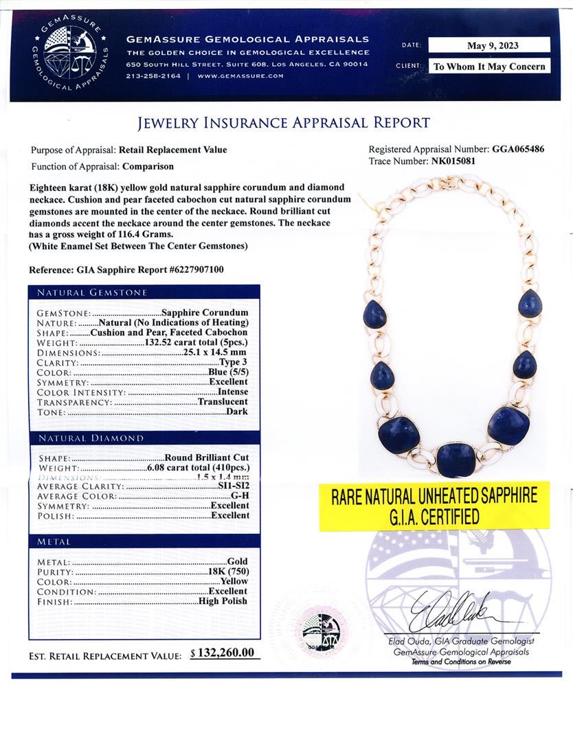 132.52ctw UNHEATED Blue Sapphire and 6.08ctw Diamond 18K Yellow Gold Necklace (GIA CERTIFIED). Eighteen karat (18K) yellow gold natural sapphire corundum and diamond neckace. Cushion and pear faceted cabochon cut natural sapphire corundum gemstones are mounted in the center of the neckace. Round brilliant cut diamonds accent the neckace around the center gemstones. The neckace has a gross weight of 116.4 Grams. (White Enamel Set Between The Center Gemstones) Reference: GIA Sapphire Report 6227907100 NATURAL GEMSTONE GEMSTONE: Sapphire Corundum NATURE: Natural (No Indications of Heating) SHAPE: Cushion and Pear, Faceted Cabochon WEIGHT: 132.52 carat total (5pcs.) DIMENSIONS: 25.1 x 14.5mm CLARITY: Type 3 COLOR: Blue (5/5) SYMMETRY: Excellent COLOR INTENSITY: Intense TRANSPARENCY: Translucent TONE: Dark NATURAL DIAMOND SHAPE: Round Brilliant Cut WEIGHT: 6.08 carat total (410pcs.) DIMENSIONS: 1.5 x 1.4mm AVERAGE CLARITY: SI1-SI2 AVERAGE COLOR: G-H SYMMETRY: Excellent POLISH: Excellent METAL METAL: Gold PURITY: 18K (750) COLOR: Yellow CONDITION: Excellent FINISH: High Polish