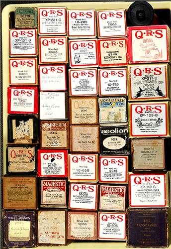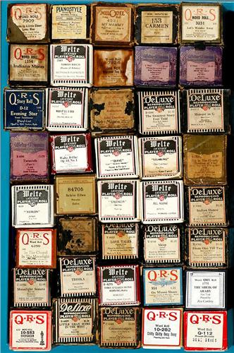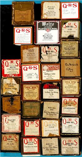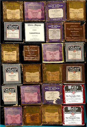 132 Pianola-Rollen "Welte" u.a. Amerikanische Notenrollen der Firmen: "DeLuxe Reproducing Roll Corp.", "Welte & Sons, New York", "Play-Rite Music Rolls Inc.", "QRS" und weiteren. Zumeist mit Betonung, aber auch 88er Rollen. Komplettes Repertoire von Bach/Beethoven bis Beatles und Little Richard. Sehr viele persönlich eingespielte Stücke mit Namen der Pianisten! Bestens geeignet für das "Welte"-Piano in dieser Auktion (Kat.-Nr. 386). - Meist guter Zustand! - Weitere Photos auf Anfrage.