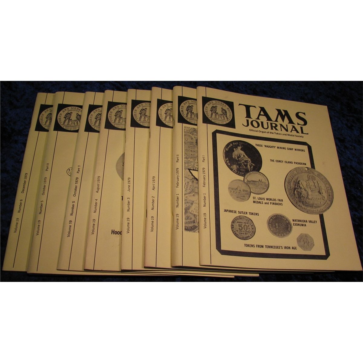 1320. 1979 "Tams Journal" Magazines. Volume 19 no. 1-6. Includes information on Naughty Mining Camp mirrors, St. Louis World's Fair Medals and Pinbacks, Texas Trade tokens, Indian Trade tokens, Underground Railroad, Vulcanite Murder case, Sporting House tokens, and North Carolina Trade Tokens.