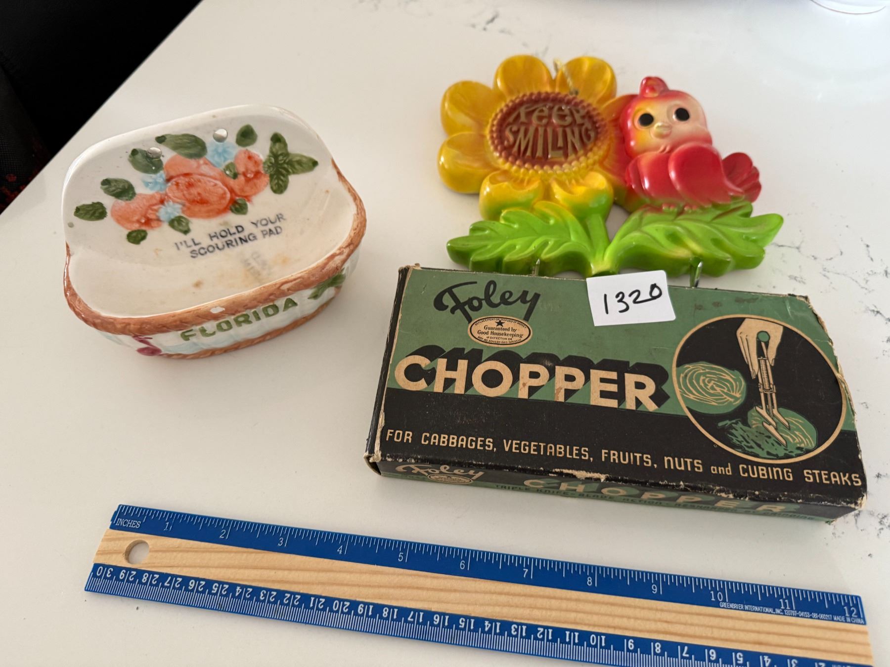 1 souring pad holder, 1 wall decoration, a foley vegetable chopper in box