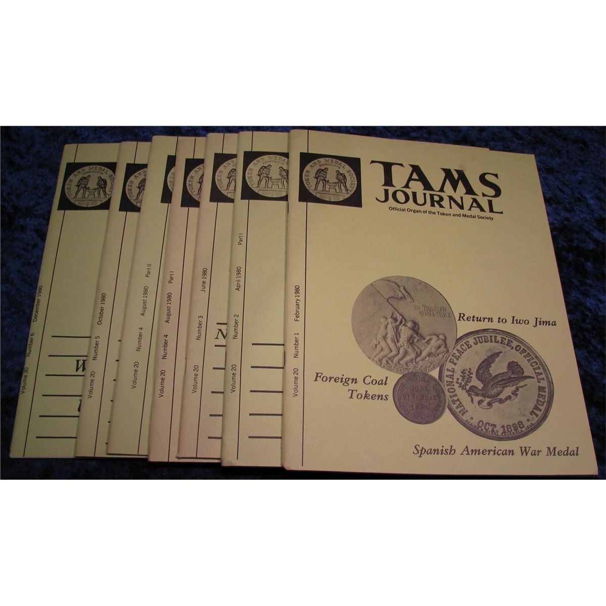 1321. 1980 "Tams Journal" Magazines. Volume 20 no. 1-6. Includes information on Foreign Coal tokens, Karl Goetz medals, Lumbercamp tokens, Fort Mackinac tokens, Mining tokens, Hawaiian exonumia, Unlisted so-called Dollars & Wisconsin Brewery tokens.