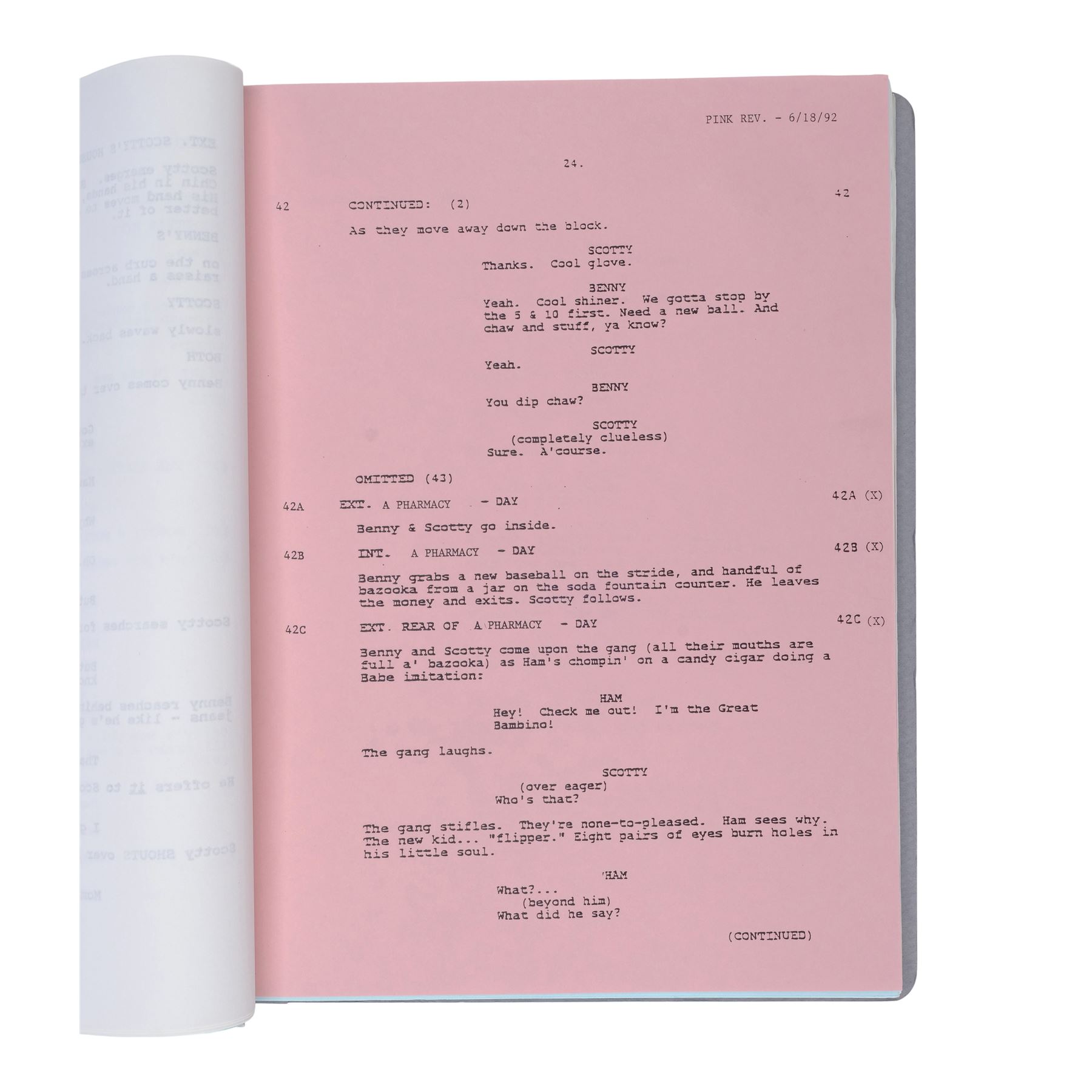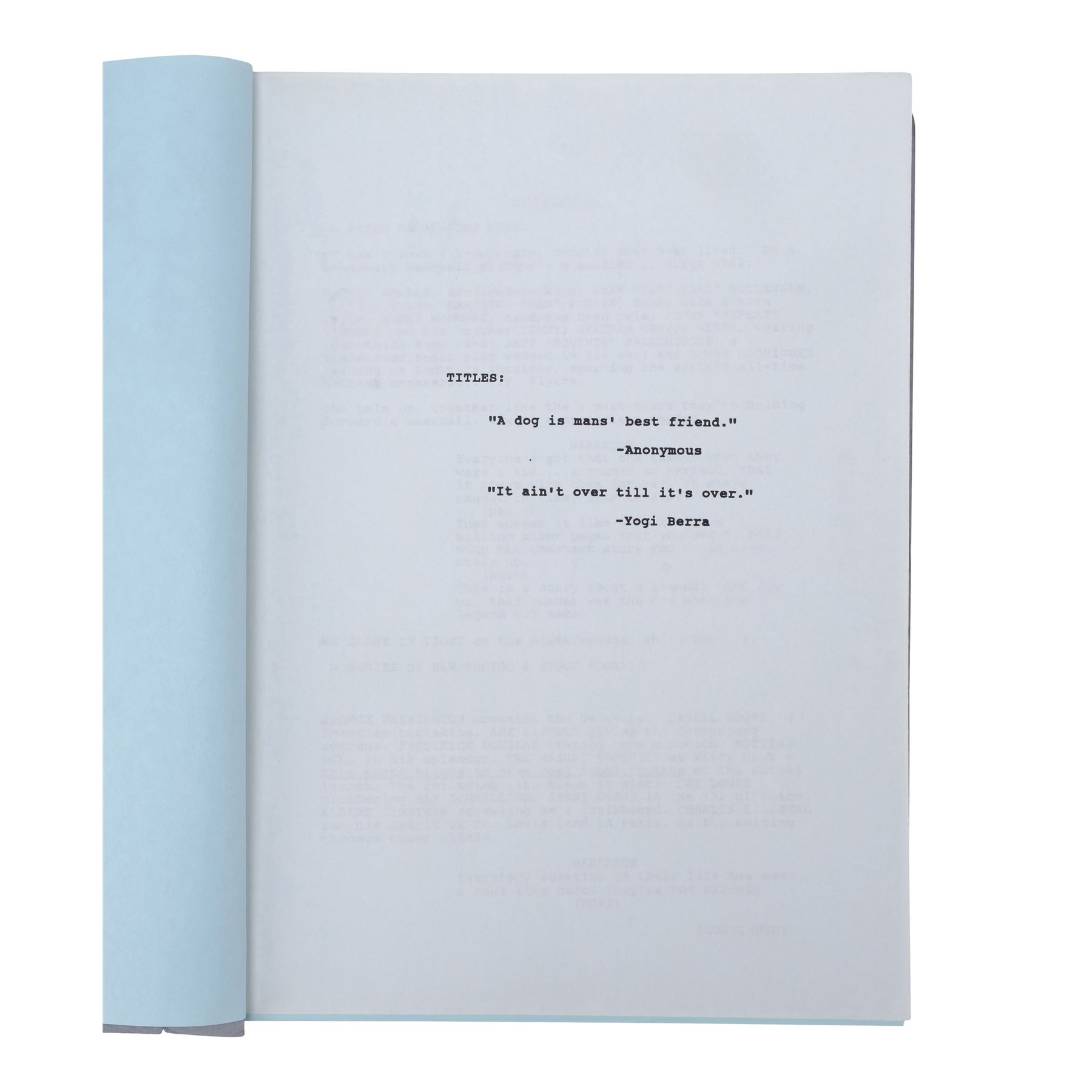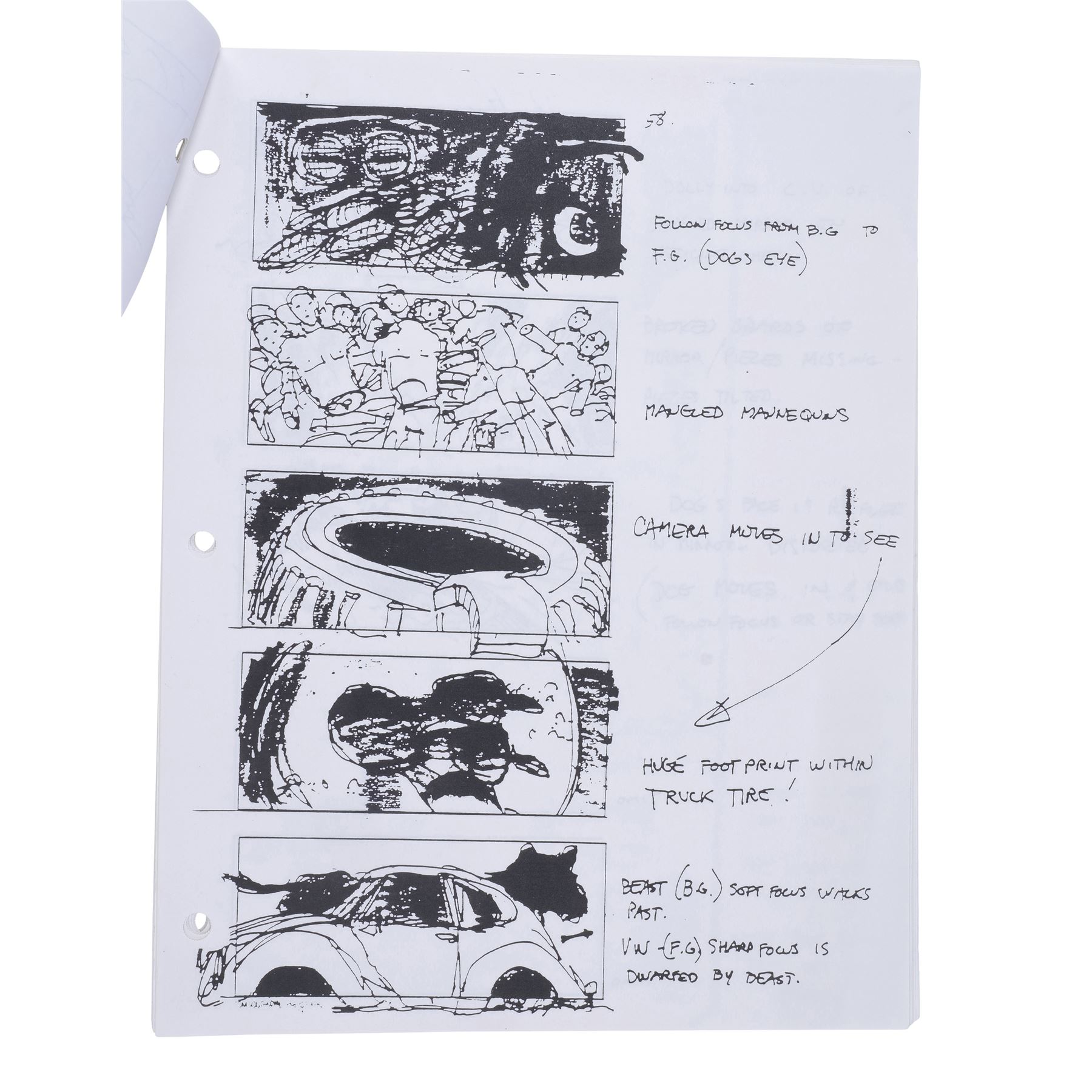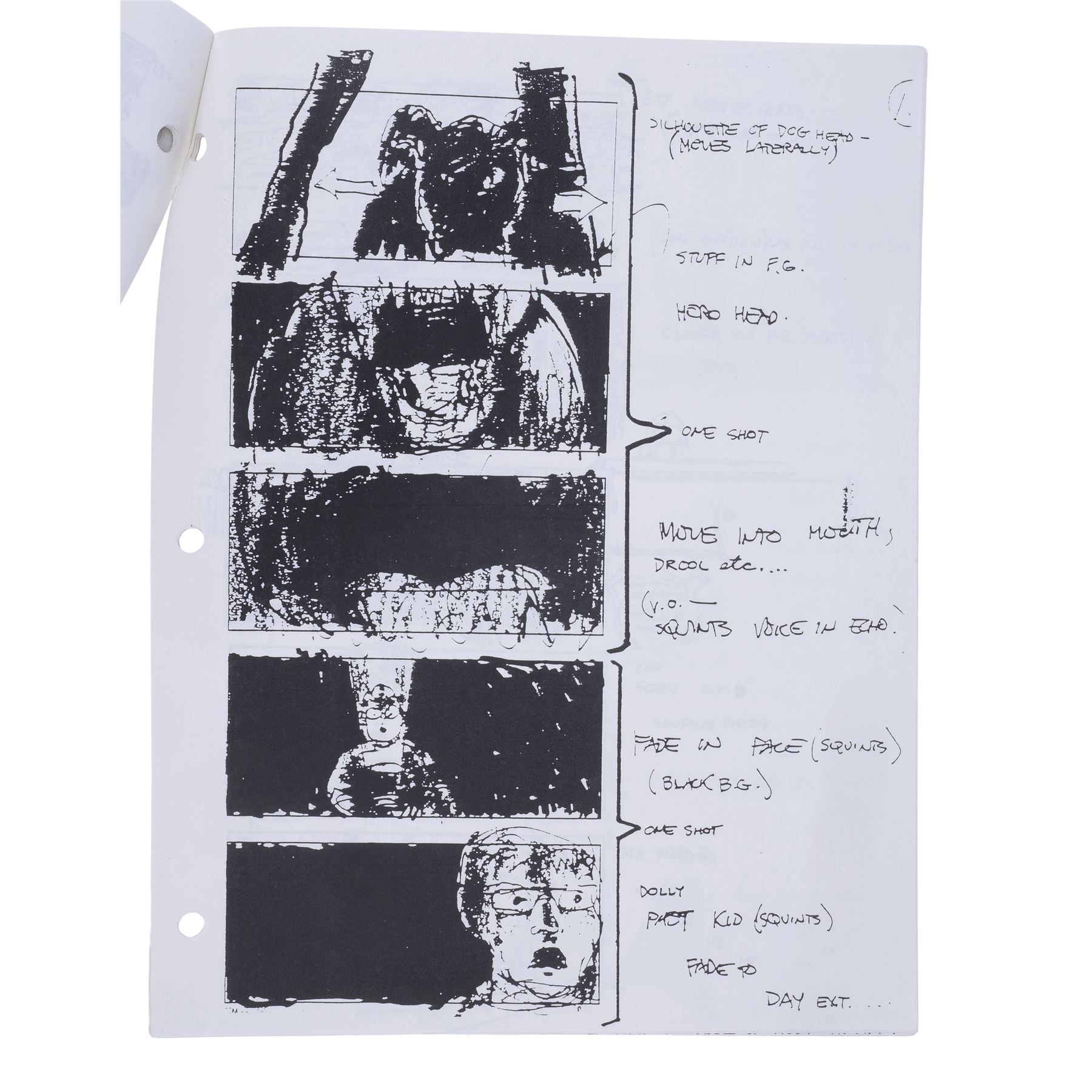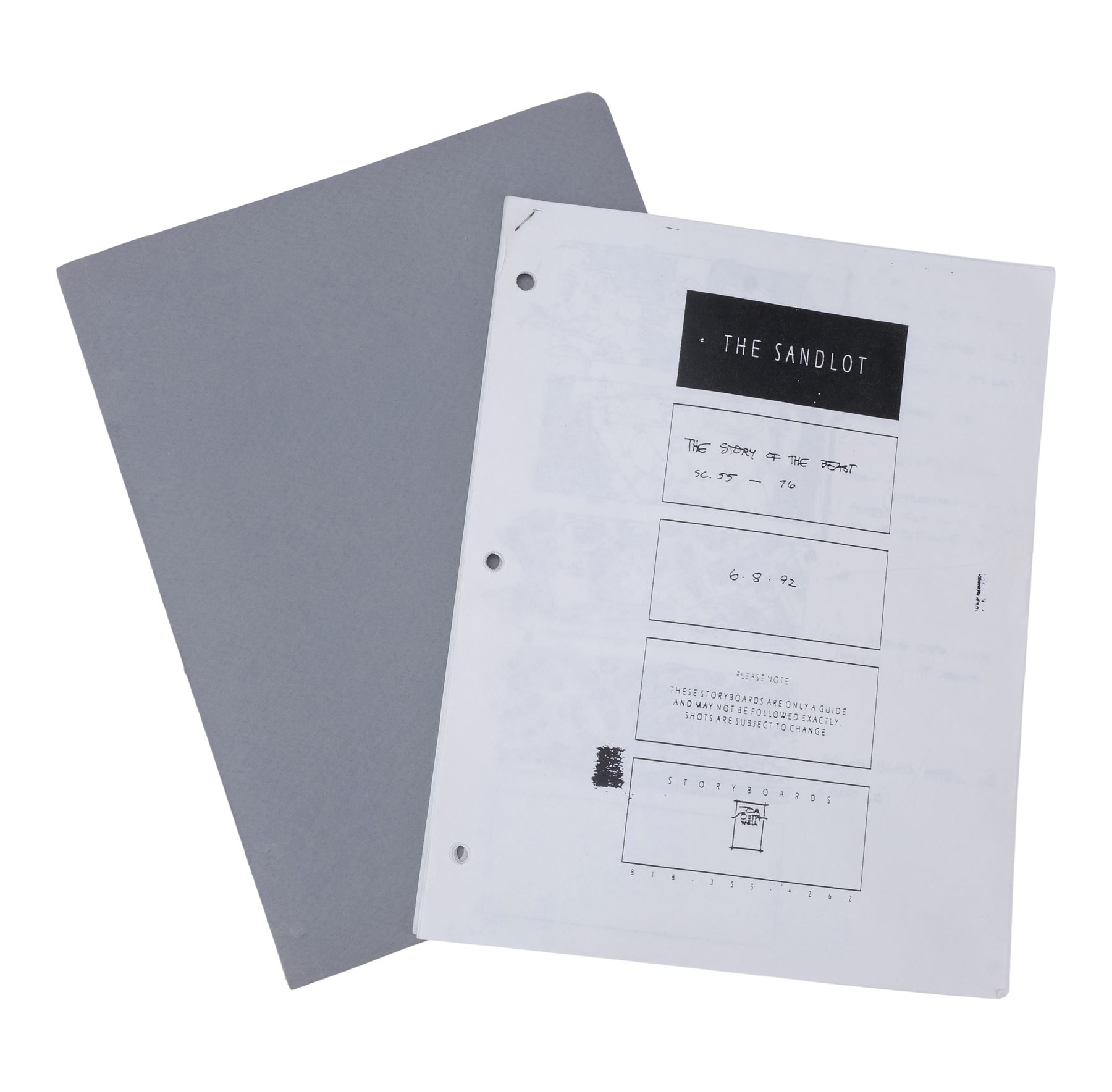 This lot consists of a 136-page, brass brad-bound third draft shooting script with a gray cardstock cover dated June 10, 1992 with revisions printed on blue paper and pink revision pages dated June 18, 1992, as well as a 30-page packet of printed storyboards titled "The Story of the Beast" depicting the sequence in which Michael "Squints"' Palledorous (Chauncey Leopardi) told The Beast's origin story. The script exhibits minor staining from production. Dimensions: (largest) 9" x 11" x 1" (23 cm x 28 cm x 2.75 cm)