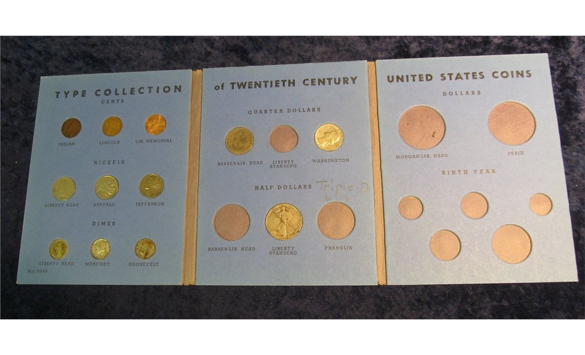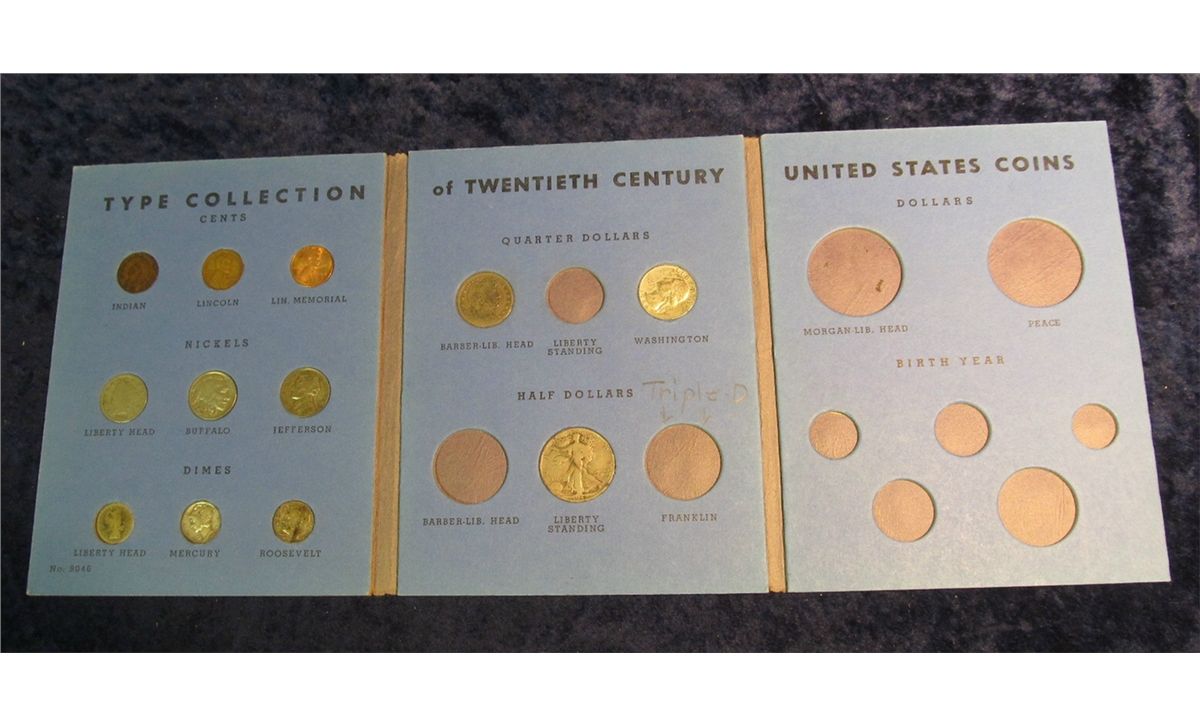 1326. Whitman folder for U.S. Twentieth Century Type Set. Contains Indian, wheat, & Memorial Cents; Liberty, Buffalo, & Silver Jefferson War nickels; Barber, Mercury, & Roosevelt Silver Dimes; Barber & Washington Silver Quarters, & a Walking Liberty Half Dollar.