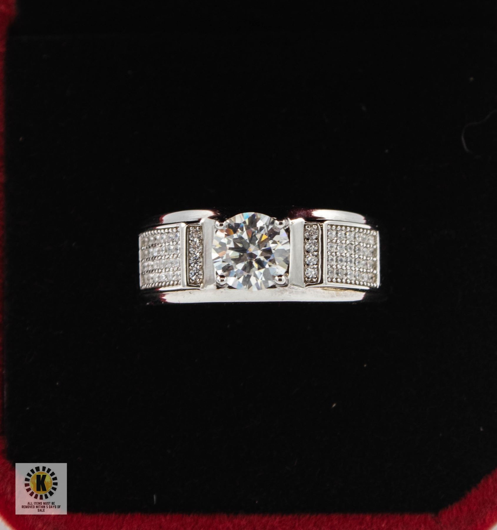 MOISSANITE STONE VVS D COLOR SET WITH 56 ROUND BRILLIANT CUT CUBIC ZIRCONIAS WITH 8 SET BESIDE CENTER MOISSANITE WITH MORE SET IN SHANKS SET IN 925 SILVER RING SIZE 9 RETAIL VALUE $825.00